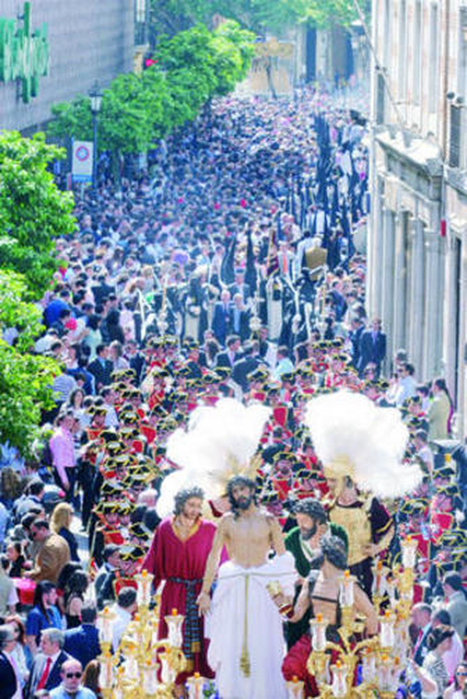 A las tres y cuarto de la tarde, los tres amigos y compañeros ocupan sus posiciones. El esfuerzo se traduce en quejidos bajo el paso, que duele en el cuello de los costaleros. Y la multitud los recompensa con un cálido aplauso.