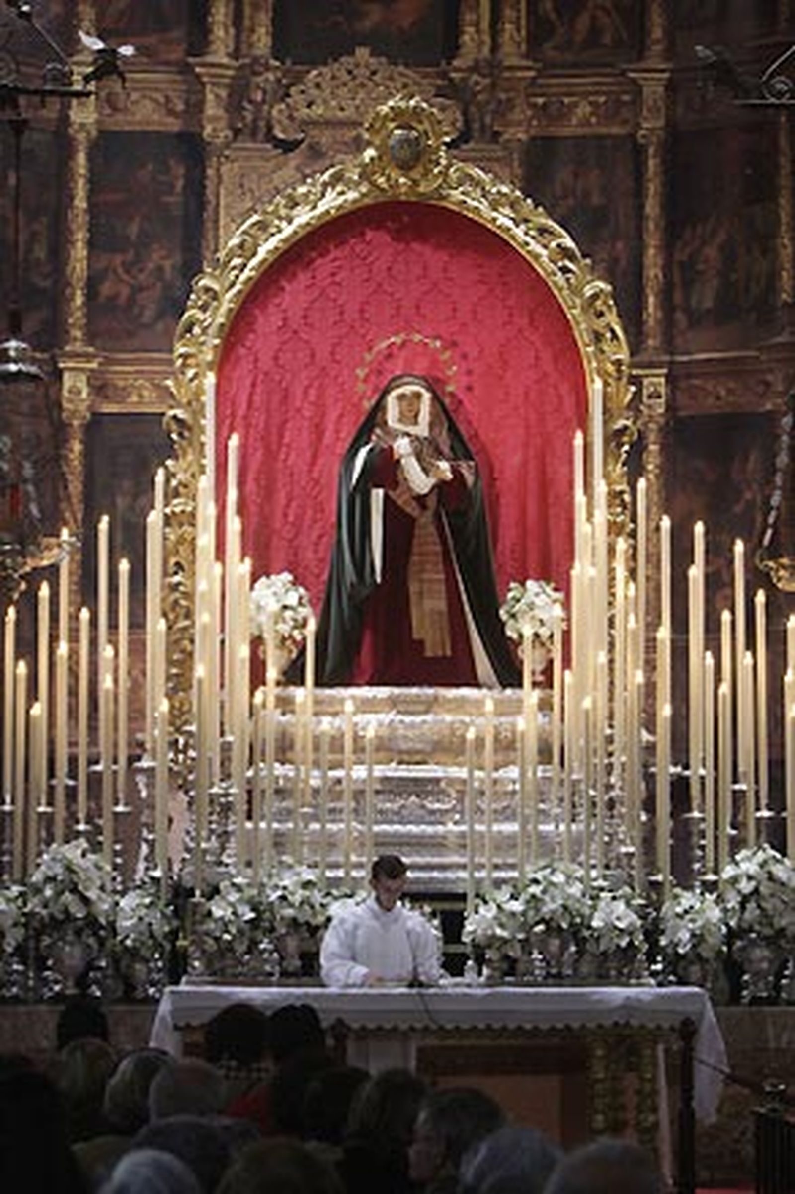 Cuando la Cuaresma traspasa el ecuador de su tiempo (definición lamiosa y cursi donde las haya) la catedral del viejo arrabal se viste de un verde oscuro como las aguas mansas del viejo Betis (venga una ración y media de ancestrales tópicos). Sobre el fondo de una recreación de lo que no está se alza un dosel de damasco rojo (a medio planchar) que circunda el medio punto de un oro al que el tiempo fue limando sus brillos.