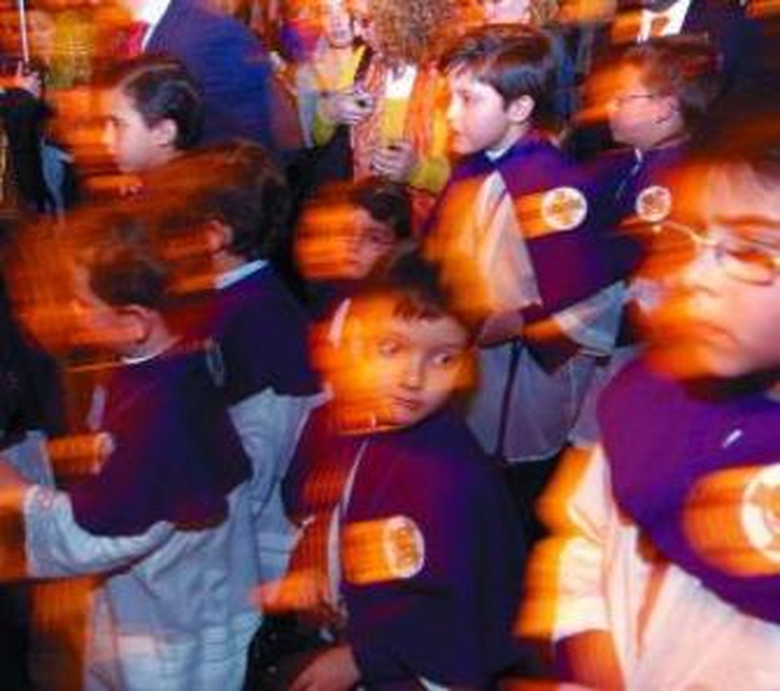 Casi un centenar de niños ponen una nota de color en un cortejo tan sobrio como el que sale de San Vicente