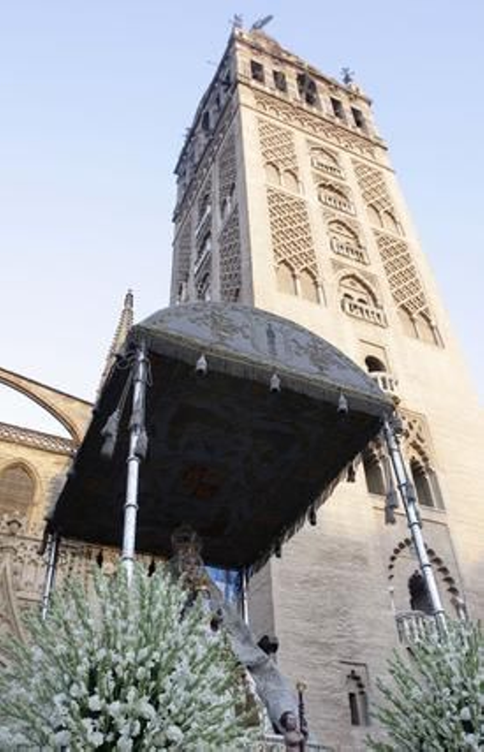 A las 08:50 el paso llegaba a la esquina de Fray Ceferino, cuando el Metrocentro hacía lo propio en la parada del Archivo de Indias. En la Plaza del Triunfo hubo una merma de público respecto a otros años. En este lugar, la banda municipal interpretó la marcha Virgen de los Reyes Coronada, de José Albero, que sonó por primera vez con tambores y cornetas.
