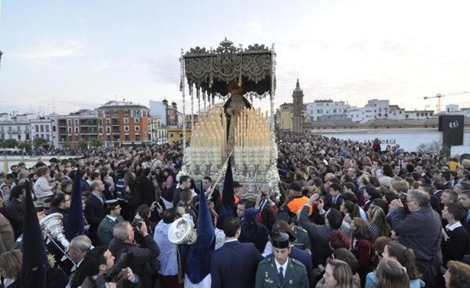 Los nazarenos del Amor se acercan al Salvador. No van solos. Muchísimos llevan de la mano a los nazarenitos de la Borriquita, estampa inusual. La última vez fue en 1999. San Pablo y Reyes Católicos se pueblan hasta el exceso desde que aparece la cruz de guía de la Estrella. Son calles anchas, idóneas para el público de carritos. El paso de misterio del Señor de las Penas luce una preciosa y generosa alfombra de lirios morados con algunas flores rojas en la trasera. Una delicia de paso. La Virgen pasa a gran velocidad por Rioja. Un año más se cantó el Ave María en la puerta del Santo Ángel. Pero todo con celeridad, sin perder de vista el cielo. Noche plena. La radio da cuenta de una emotiva levantá por los sevillanos no nacidos en el Salvador. Sonido de cascabeles.