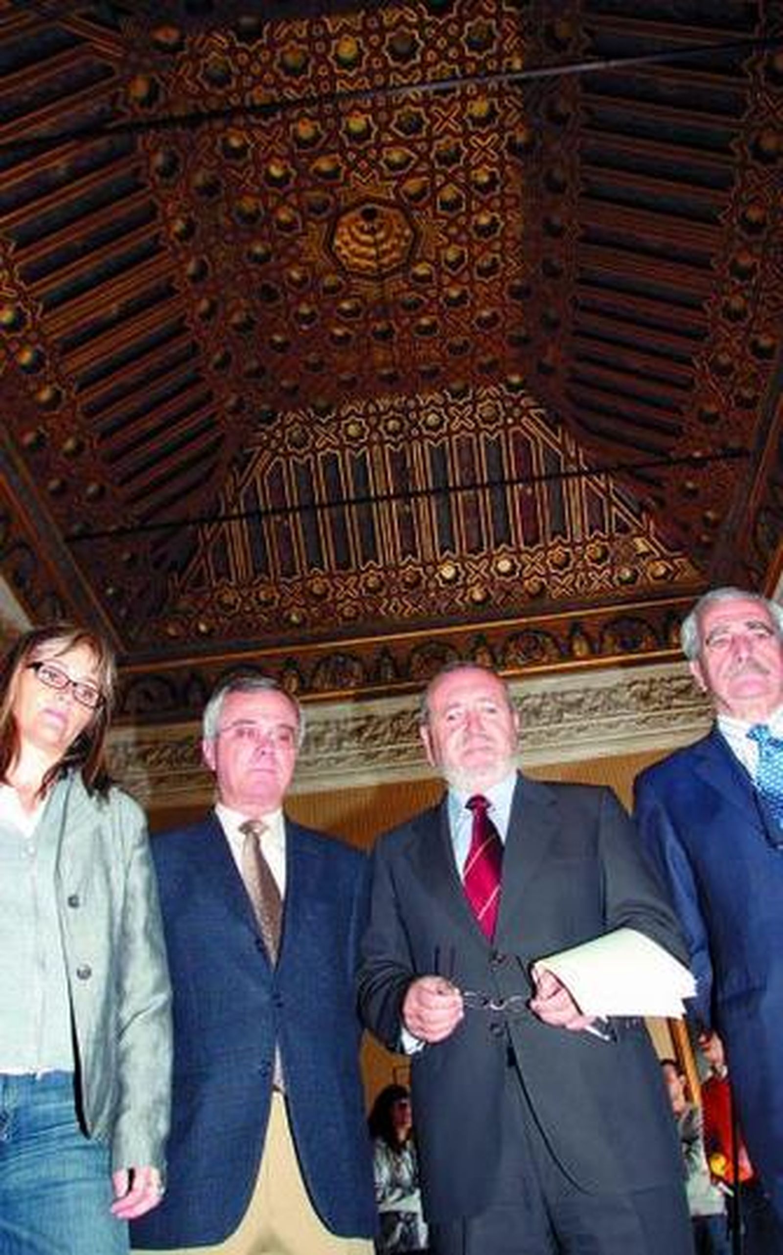 El equipo de restauradores que lidera la experta Inmaculada Ramírez López ha finalizado la rehabilitación de los armazones y artesonados que componen el alfarje del techo del antecomedor de familia del Cuarto Real Alto de los Reales Alcázares de Sevilla, constituyendo ésta la octava pieza de esta naturaleza que se somete a restauración dado su origen en el arte mudéjar. El alcaide del Alcázar, Antonio Rodríguez Galindo, y el director conservador del recinto palaciego, José María Cabeza, presentaron ayer junto a Ramírez el resultado de estos trabajos de restauración que han contado con un presupuesto de 71.923 euros y que han supuesto la recuperación de esta armadura que orna el techo de la estancia con una abigarrada decoración de grutescos, escudos y mascarones de madera policromada. Cabeza y la directora del equipo de restauración recordaron que, al igual que otras piezas similares, este armazón mudéjar habría lucido en las estancias del Palacio del Rey Don Pedro o Palacio Mudéjar hasta su reubicación en el Cuarto Real Alto, una vez éste fue construido ya bajo el reinado de Carlos V, con lo que la pieza atesora motivos mudéjares y renacentistas con un predominio de este segundo estilo. Asesorados por la arquitecta Cecilia Cañas Palop, los restauradores han usado técnicas análogas a las primigenias para recuperar las policromías.