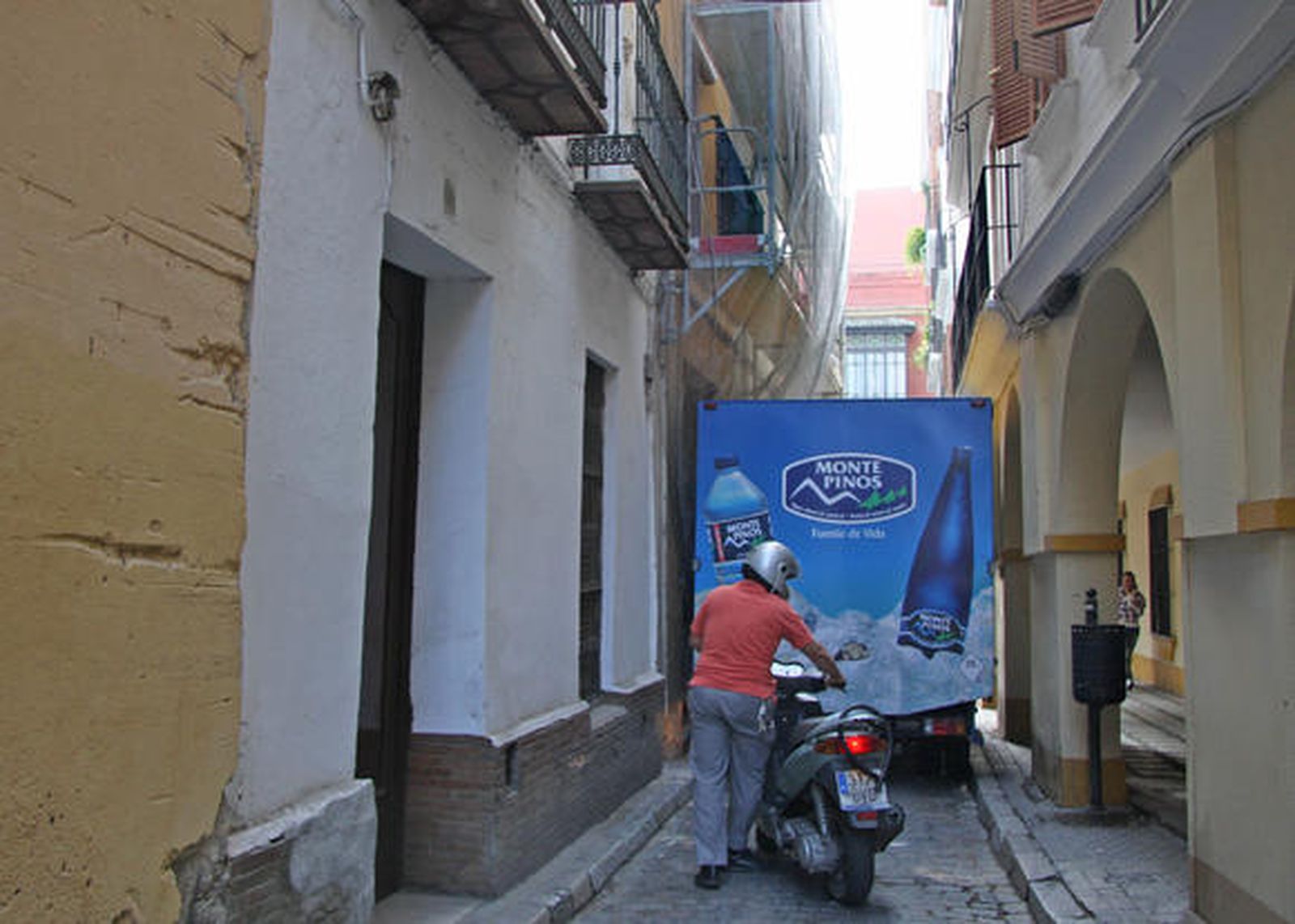 Más elementos en contra no se pueden dar para que a este camión le sea casi imposible circular por la angosta calle Fabiola. A las estrecheces propias de la calle se suma la colocación de un andamio, lo que dificulta la maniobra que, finalmente, desesperó al motorista.