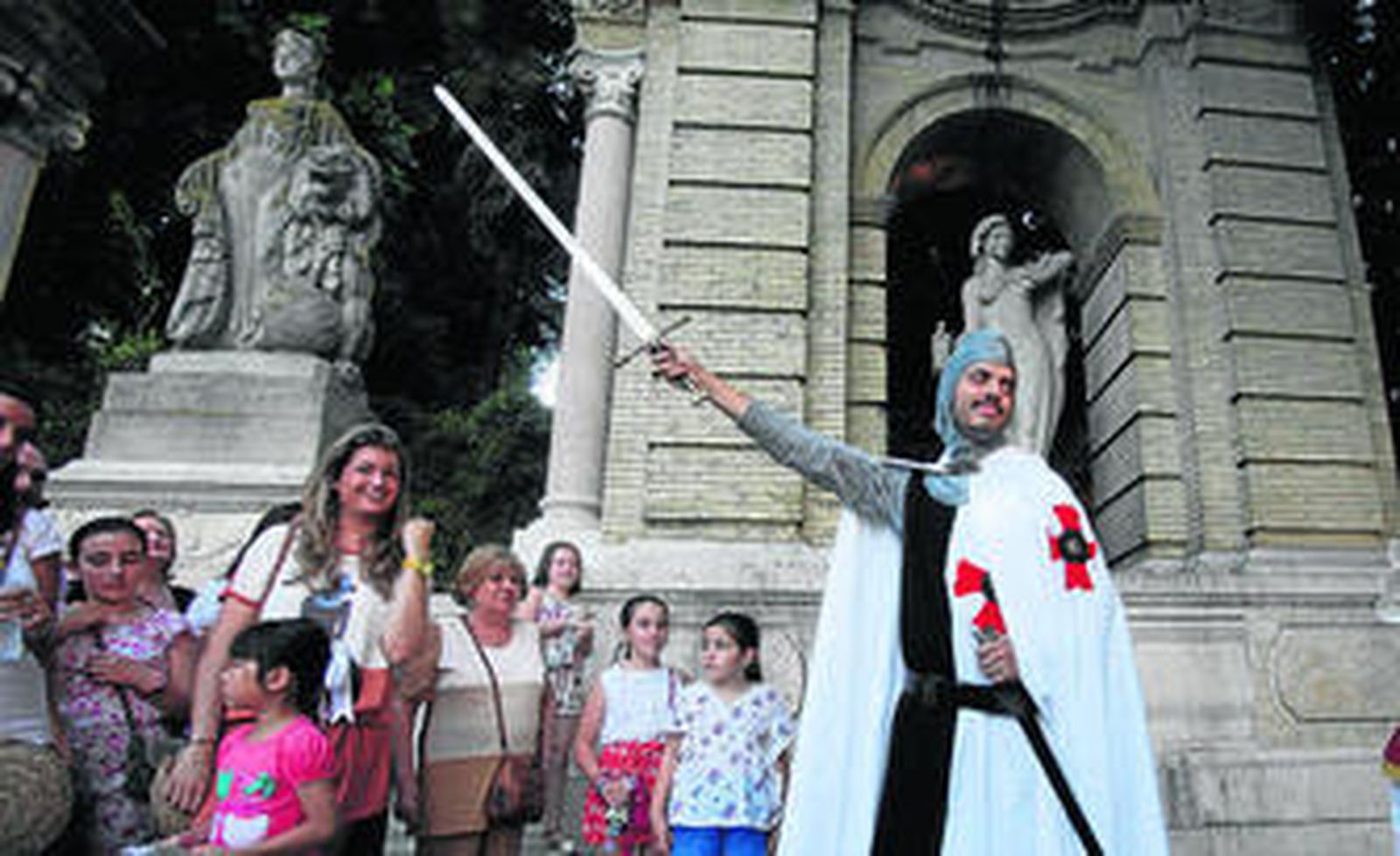 Al primer ensayo con público acudieron casi un centenar de personas. La cita era en la glorieta de San Diego. "Aquí está la marca España". Habla junto a la estatua de Pérez Comendador la Dama del Parque, la guía que adentrará a los visitantes a un sinfín de sorpresas. La encarna Virginia Cano (Sevilla, 1984), actriz y cantante. Rodrigo Díaz de Vivar, El Cid Campeador, ha dejado a Babieca en la estatua ecuestre porque el carril-bici puede asustar al caballo más poético de la historia, al más cinematográfico. El Cid vino a la Sevilla de Al-Mutamid para cobrar unos tributos de parte de Alfonso VI de Castilla y defendió la ciudad de la invasión de Abdulah de Granada. Al personaje le da vida Jerónimo Aparicio (Sevilla, 1984), que después se multiplicará en Torcuato Luca de Tena y en Miguel de Cervantes. Estudió Filosofía, hizo incluso un máster en Filosofía Política, aspira a enseñar esa materia en algún instituto, pero el teatro es su pasión.