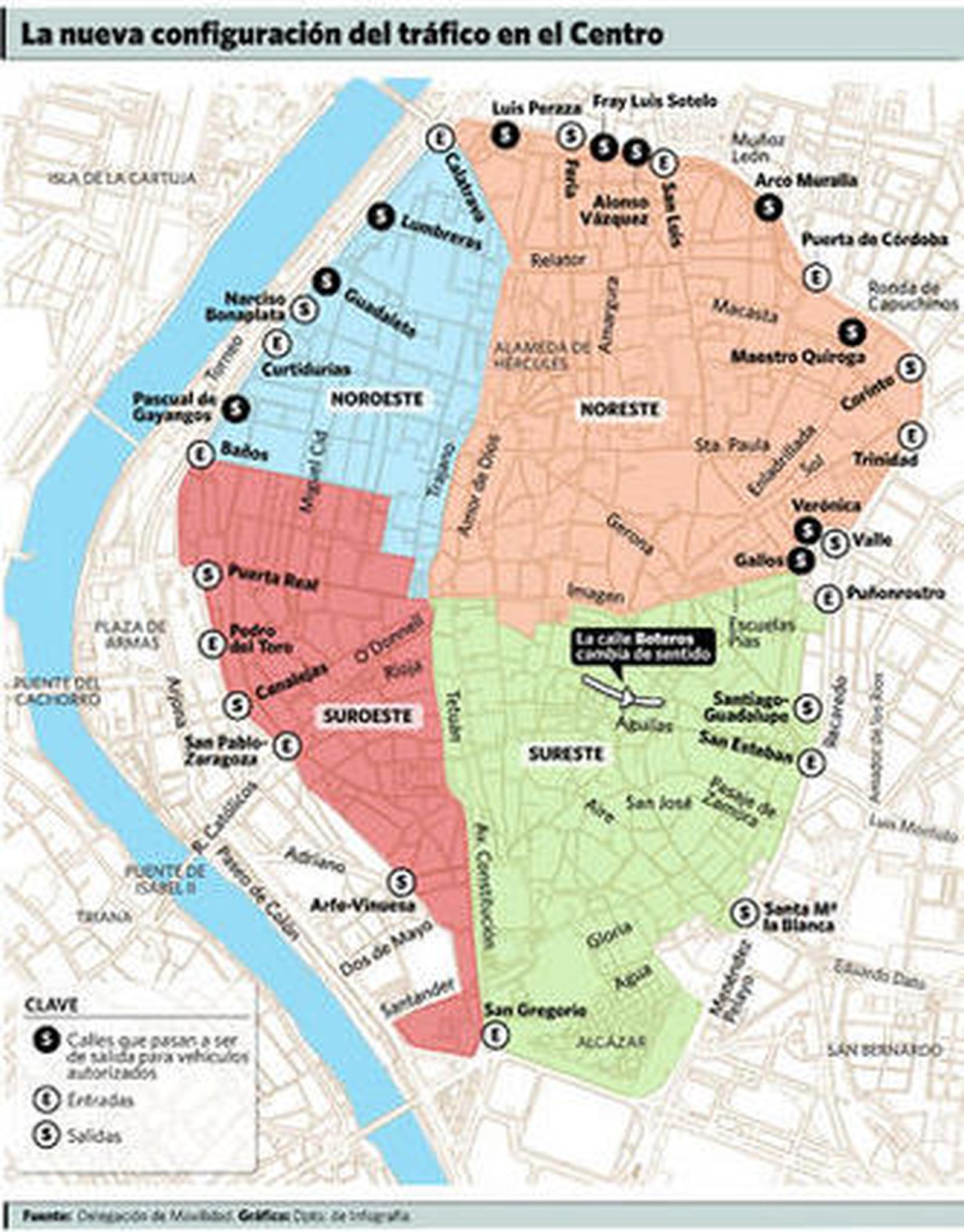 En lo único que se ha mostrado flexible la delegación de Movilidad ha sido en eliminar la división por sectores para los residentes. Cuando se presentó el plan, este dividía el centro en cuatro zonas estancas, de manera que un coche que accedía por una de estas cuatro áreas tenía que salir luego obligatoriamente por otra calle incluida dentro del mismo sector. Ahora esta medida sólo está contemplada para los no residentes, mientras que los que hayan acreditado su residencia en el centro pueden circular libremente por cualquiera de los cuatro sectores. Los no residentes también están obligados a salir del centro en los 45 minutos inmediatamente posteriores a la entrada, salvándose sólo de la multa de 90 euros en el caso de que utilicen alguno de los aparcamientos subterráneos del casco histórico.