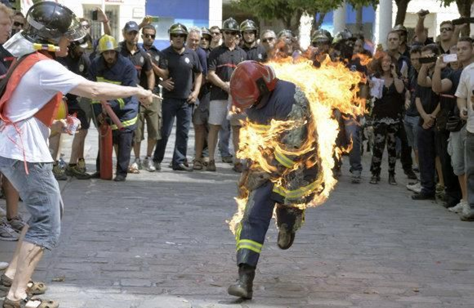 Un bombero con traje ignífugo se prende fuego para hacer visible su malestar con el Ayuntamiento