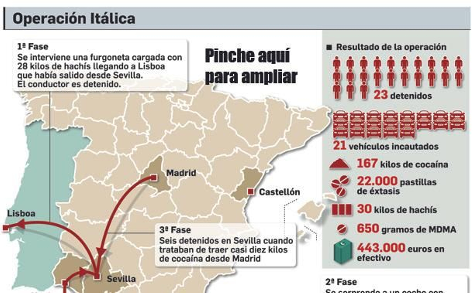 La vigilancia sobre este taller permitió a la Unidad de Drogas y Crimen Organizado (Udyco) de la Policía Nacional en Sevilla iniciar en junio de 2015 la operación Itálica, llamada así por la cercanía del taller con las ruinas romanas. Un año después, los agentes de esta unidad, con la colaboración de un buen número de policías de otros grupos, han desmantelado una compleja organización de narcotraficantes compuesta por 23 personas de distintas nacionalidades. Entre los detenidos, todos ellos hombres de edades comprendidas entre los 25 y los 50 años, hay españoles, portugueses, colombianos, marroquíes, peruanos y un holandés. Todos ellos están ya en prisión preventiva.