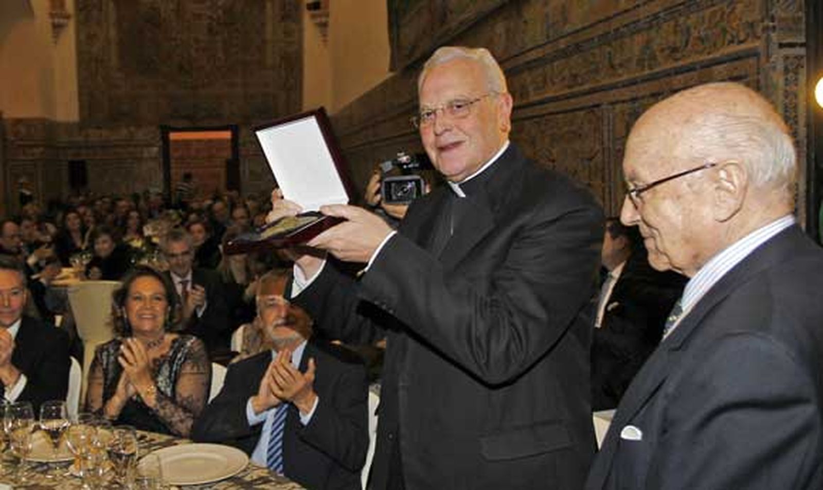 En la imagen, el cardenal Amigo muestra el reconocimiento a los asistentes en presencia de Manuel Clavero.
