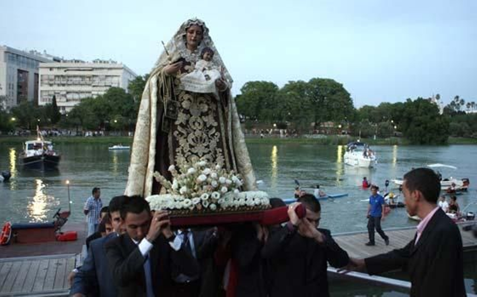 Un catamarán engalanado para la ocasión cedido por el Centro Deportivo de Alto Rendimiento de la Isla de la Cartuja zarpó rumbo al sur pasadas las ocho de la tarde. Trasladada en unas andas cedidas por la Hermandad del Cachorro, fue recibida bajo los ojos del Puente de Triana por una gran petalada lanzada desde el tablero por cientos de fieles.