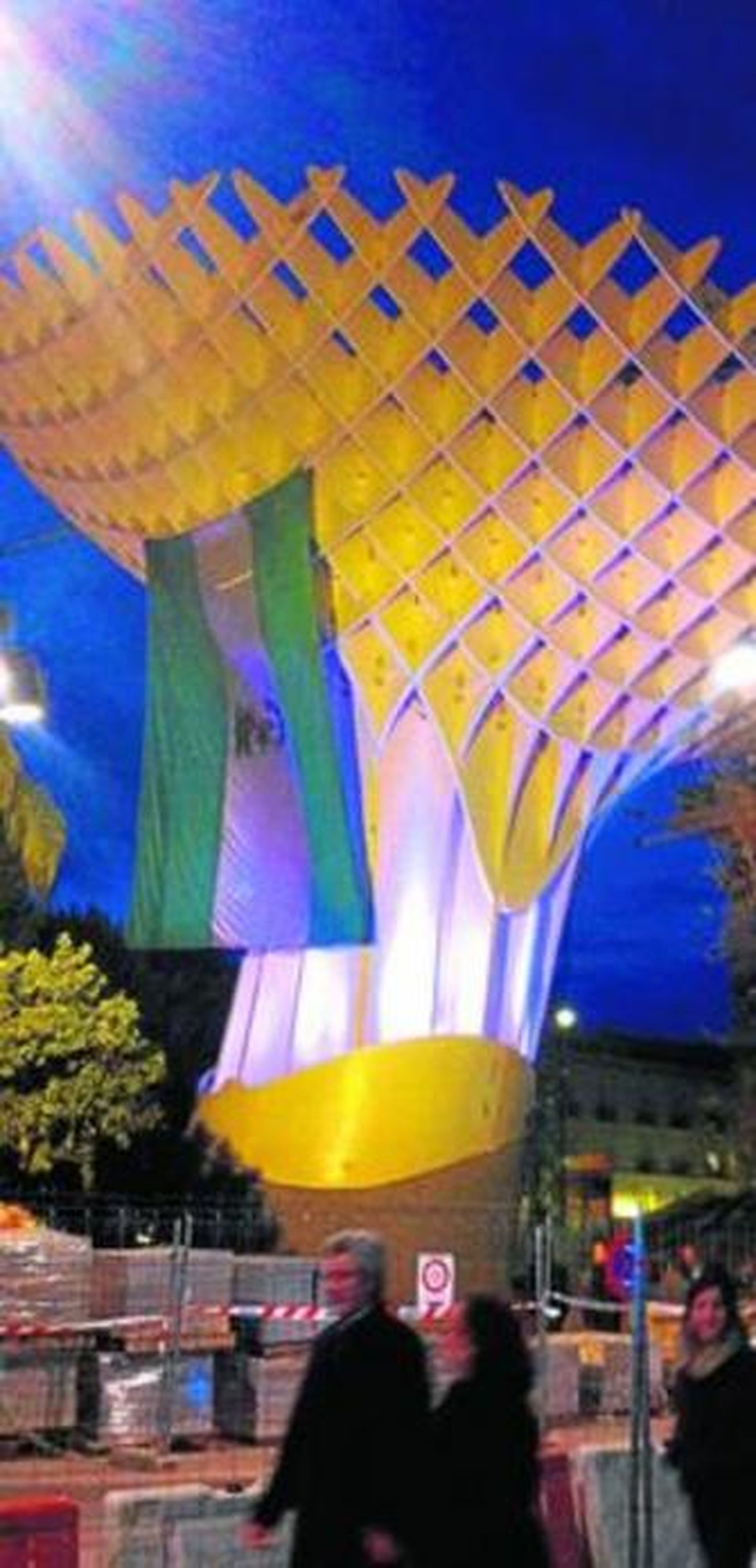 El delegado de Urbanismo, Manuel Rey, el vicepresidente de la compañía Metsallitto Wordproducts Industry, Mika Kailo, y el director gerente de Finnforesterk, Fritz Kunz, así como el director de Sacyr en Andalucía, Antonio Belmonte, colocaron ayer la última de las 3.500 piezas de la estructura de madera del espacio Metropol Parasol, cuyo andamiaje comenzará a retirarse la próxima semana. "Quedan pendientes únicamente tableros embellecedores del puente metálico entre el Parasol Imagen y el Parasol Pellón, así como otros elementos de madera no portantes de la estructura", según ha informado el Consistorio hispalense. Además, en la tarde de ayer, se estaban realizando algunas pruebas de iluminación en el nuevo espacio.