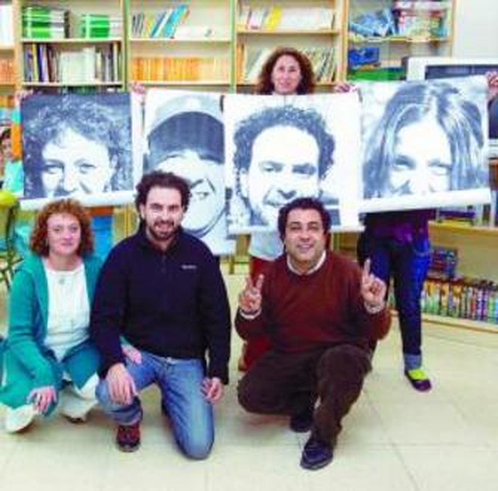 Mientras, en un aula, se repartían fotocopias ampliadas de fotografías de los alumnos participantes en el taller de pintura y de cuatro miembros de la comunidad educativa -Emilio Vela, la profesora de religión Macarena Mijes, la monitora de educación especial Mariló y el limpiador Andrés- que los niños comenzaron a colorear bajo las instrucciones de Javier Fito, al que Noelia, de 7 años, no soltaba ni un momento.