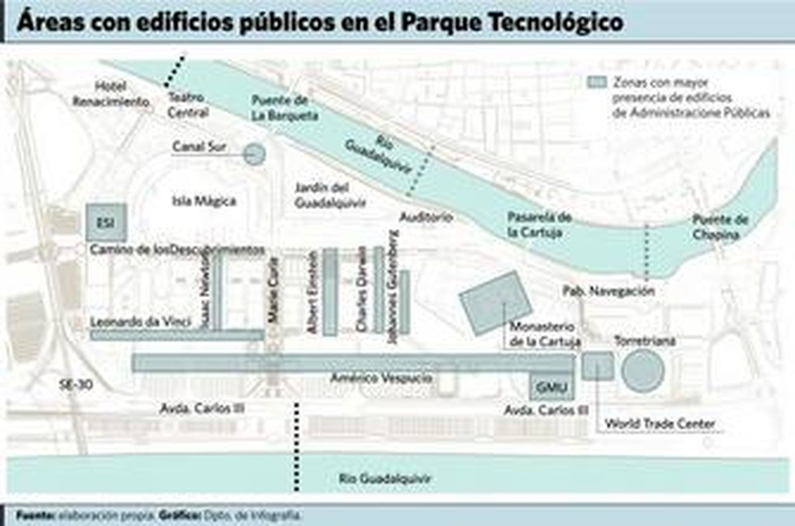 Hay más de una treintena de edificios con servicios públicos en el parque entre Facultades y Escuelas Universitarias, consejerías de la Junta y delegaciones municipales, institutos y agencias de investigación, medios de comunicación públicos y sociedades públicas. Se concentran sobre todo en el edificio Torretriana, en la banda de servicios entre la avenida Américo Vespucio y Carlos III, en el World Trade Center, en la calle Leonardo Da Vinci, Camino de los Descubrimientos, Isaac Newton, Charles Darwin y Johannes Gutenberg.