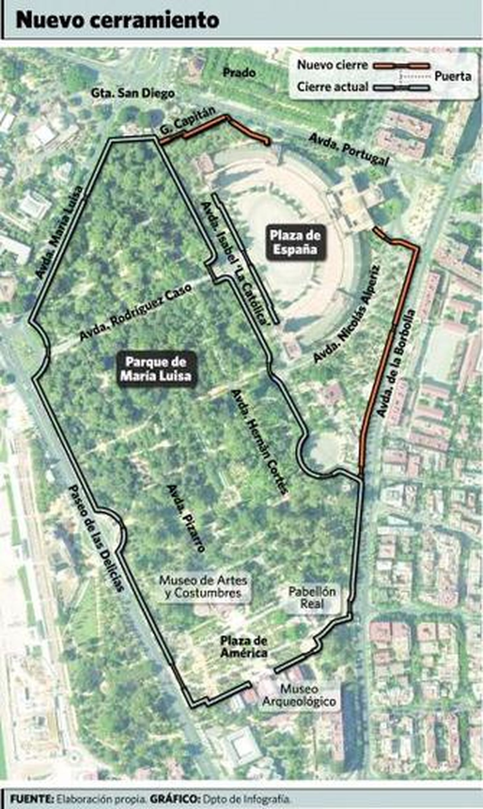 Con un plazo de ejecución de entre 10 y 12 meses, la integración de la Plaza de España al parque contempla la instalación de cinco cancelas como nuevos accesos peatonales a la altura del restaurante La Raza (Glorieta de San Diego), en la vía de acceso desde la Avenida de Portugal, en el acceso por la Avenida Nicolás Alpériz, en un tramo de ésta que da a la Borbolla y en la glorieta del Colegio España. Además de estas nuevas puertas, el perímetro de la Plaza de España será vallado para evitar el acceso peatonal al monumento tras el cierre del parque.