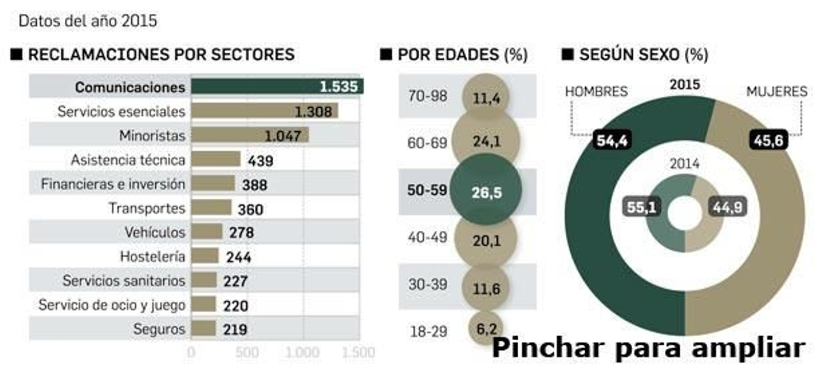 El número de reclamaciones referidas a servicios esenciales (1.308) sólo es superado por el sector de las comunicaciones (1.535), que representan al 21,93% del total. "Desde que existe el teléfono móvil es el sector con más quejas", incide Ballesteros. Gran parte de los conflictos se resuelven mediante el sistema de mediación. "En un máximo de unas tres semanas se suelen solucionar los problemas", añade el especialista en Consumo. Las quejas más habituales se refieren a la facturación y la portabilidad.