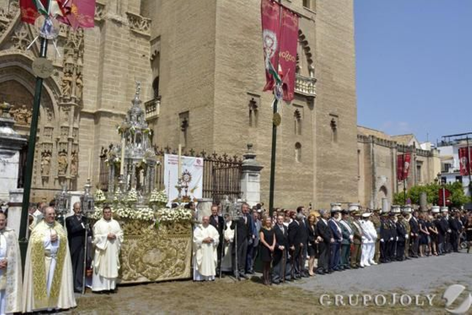 La procesión ha cumplido con los horarios previstos en una jornada fresca con poco público y en la que la Giralda ha lucido engalanada, por coincidir la fiesta eucarística con el nombramiento del nuevo Rey.