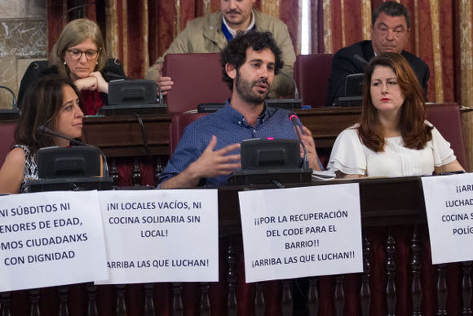 Unos miembros de la asociación Chalavipen Mashkarno del Polígono Sur, conocida por la Cocina Solidaria que promueve en la zona, han sido desalojados del pleno ordinario que celebraba este viernes el Ayuntamiento, al interrumpir la sesión con una protesta en la que han alzado pancartas reivindicativas. Ante esta inesperada protesta, la presidenta del pleno, la concejal socialista Carmen Castreño, les ha pedido al menos dos veces que depusiesen su actitud, ordenando finalmente a la Policía Local que interviniese, con el consiguiente desalojo de estas personas del salón de plenos.