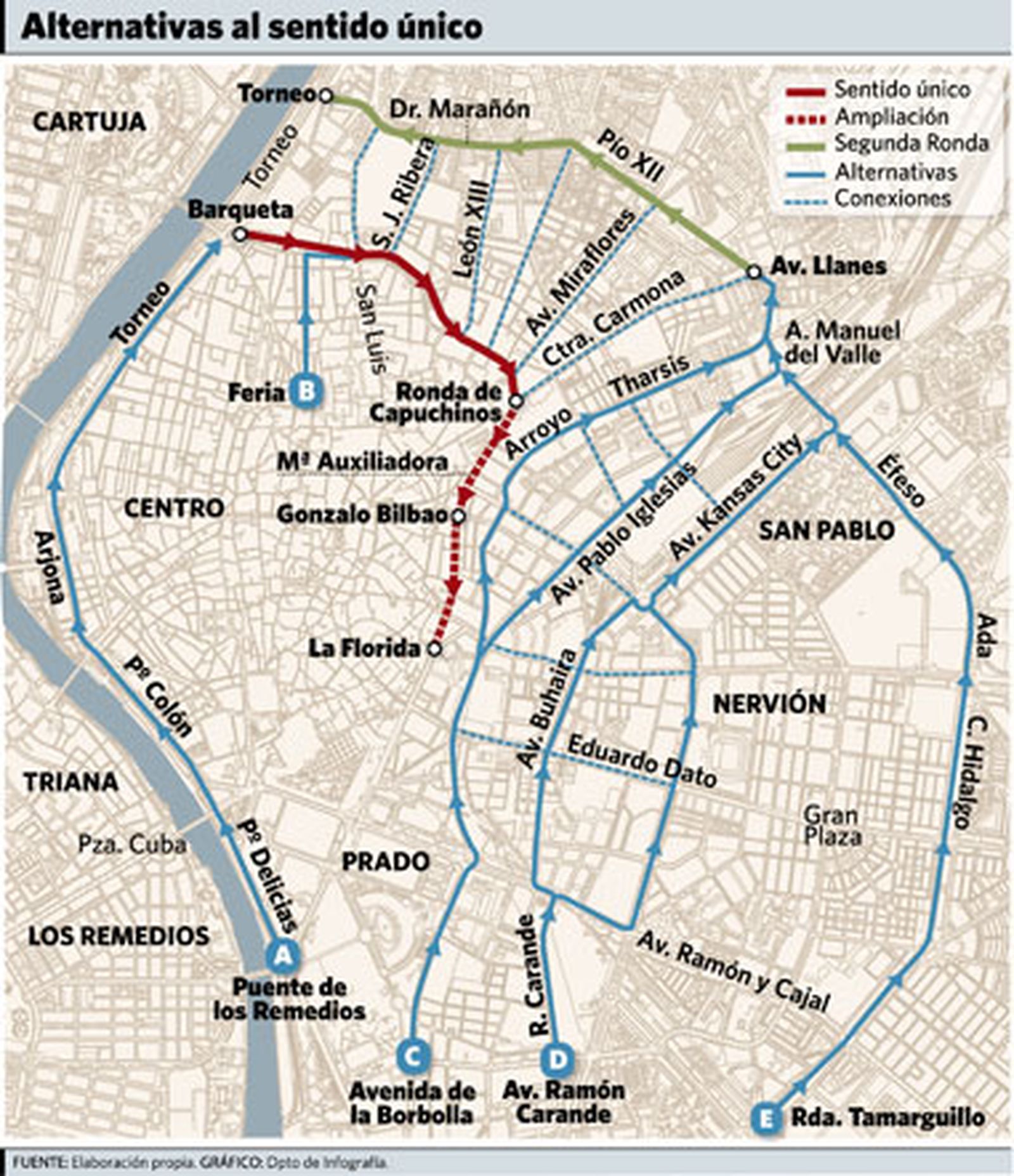 Se trata de rutas para llegar a la segunda ronda de avenidas de la Macarena sin pasar por el embudo de la Carretera de Carmona: por Torneo, por la ronda del Tamarguillo (hasta Alcalde Manuel del Valle), por Kansas City (cruzando antes la Buhaira o San Francisco Javier), y por la avenida de la Borbolla hasta llegar a Arroyo o a Pablo Iglesias. Ayer, el delegado de Movilidad explicó que con los paneles informativos se recomienda a los conductores del sur y del este de Sevilla que circulen por Arroyo o por Pablo Iglesias para alcanzar Torneo. “Queremos rentabilizar al máximo el viario de la ciudad” que se utiliza menos, dijo el concejal, quien aseguró que “la conexión de la ciudad por todos sus puntos sigue garantizada pese al sentido único de la Ronda”. El Ayuntamiento no tiene aún claro si Arroyo y Pablo Iglesias también se convertirán en sentido único en algún momento, como lo será la segunda ronda de la Macarena.