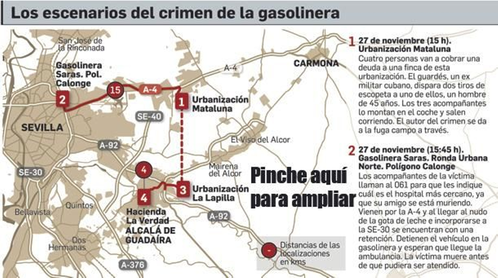 Un ex militar cubano, Alberto H. B., de 52 años, fue el autor del crimen de la gasolinera Saras del polígono Calonge. Trabajaba como guardés en una finca de la urbanización Mataluna -en el término municipal de Carmona pero muy cerca del aeropuerto de San Pablo- a la que, sobre las tres de la tarde del pasado 27 de noviembre, acudieron cuatro personas a cobrarse una deuda. Iban a bordo de un Volkswagen Touareg de color oscuro. Hubo una discusión y un momento de tensión entre el dueño de la finca y los acreedores. El cubano, viendo amenazado a su patrón, abrió fuego contra ellos. Disparó dos veces con una escopeta de caza y alcanzó en el pecho a un hombre de 45 años, el propietario del Touareg. Luego se dio a la fuga a pie y estuvo siete días viviendo en el campo, alimentándose de las frutas que robaba y ocultándose en casas abandonadas y construcciones en ruina. Llevaba consigo la escopeta, que abandonó poco antes de ser detenido por el Grupo de Homicidios de la Policía Nacional.