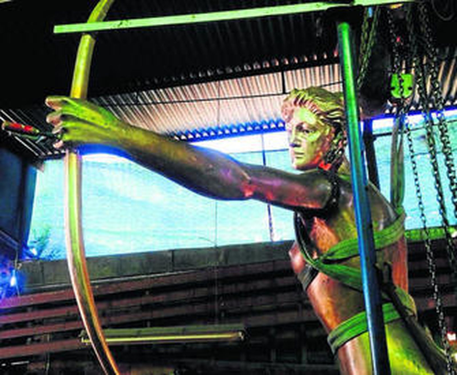 La escultura de Diana Cazadora proyectada para presidir el Muelle de Nueva York vuelve a lucir completa. Hace unos días ha sido repuesta una nueva cabeza después de que ésta fuera robada del taller de fundición, que se encuentra en la localidad de Valencina de la Concepción, separándola del cuerpo, al que sólo se encontraba sujeta por dos puntos de soldadura en el momento de la sustracción. Gracias a que se conservaban los moldes originales, se ha podido sacar una nueva cabeza en bronce siguiendo el mismo proceso de elaboración a la cera perdida.