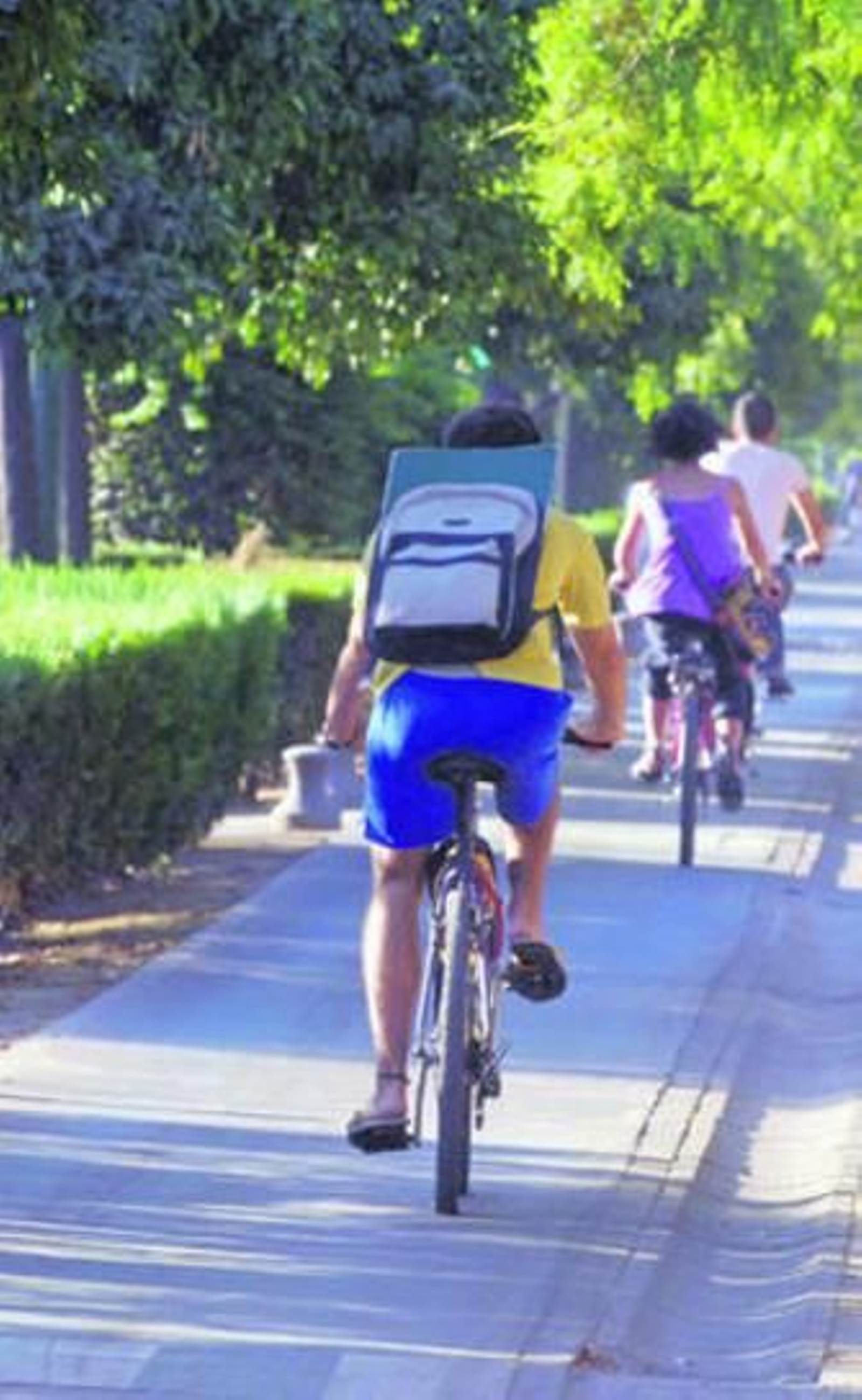 La bicicleta se ha convertido en una ventaja y en un nuevo peligro para el viandante. "¡Pedro, Lucía, salir ya, cuidado con la bicicleta!", dice un abuelo a sus nietos junto a una de las fuentes de la Alameda que en busca de refresco también atraviesan los ciclistas.