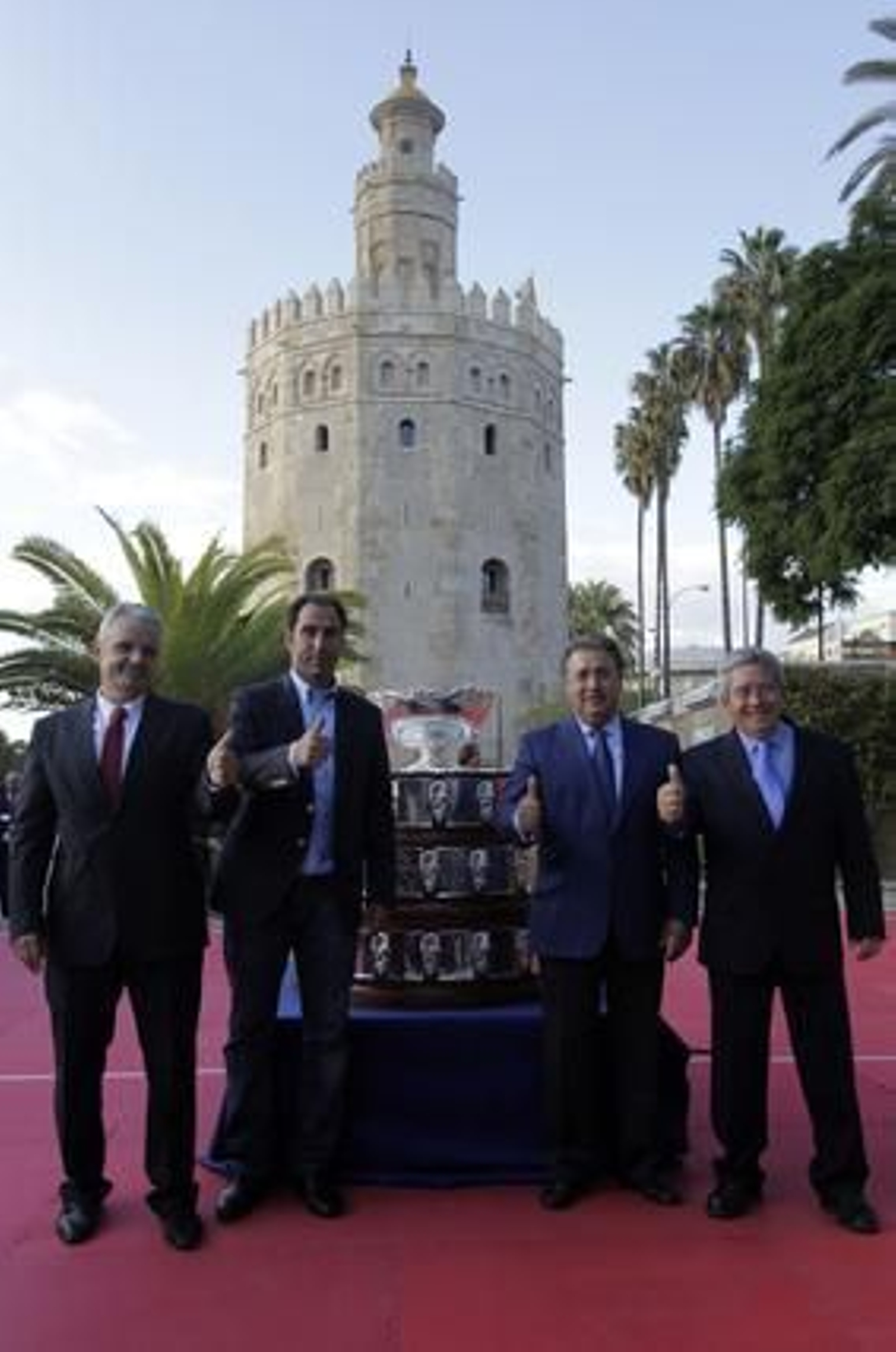 El presidente de la RFET, junto a Albert Costa, también ha aprovechado la llegada del trofeo para firmar con el alcalde de la capital andaluza el acuerdo por el que Sevilla se convertirá, del 2 al 4 de diciembre, en la sede de la final de la Copa Davis.