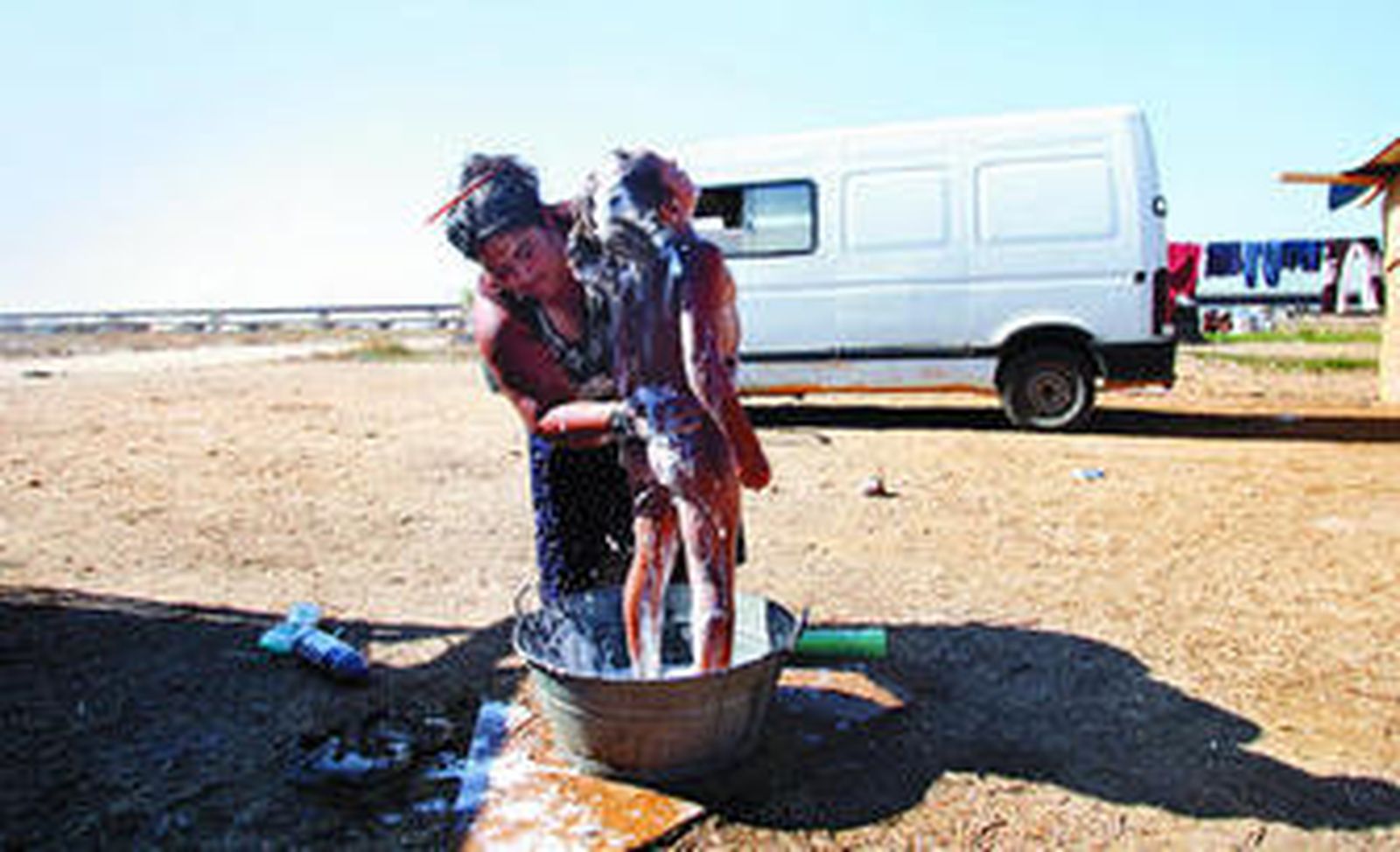 La obtención del líquido elemento es la mayor garantía de existencia. Todos buscan agua, por muy lejos que esté. Ángel Carrillo, sus primos y sobrinos la encontraron el martes en el Parque de los Príncipes. Desde allí tuvieron que volver al asentamiento con todo el peso de la calor sobre sus espaldas. Ahora su mujer, Rebeca, lava en un barreño a sus seis hijos mientras Ángel da el biberón al más pequeño de todos.
