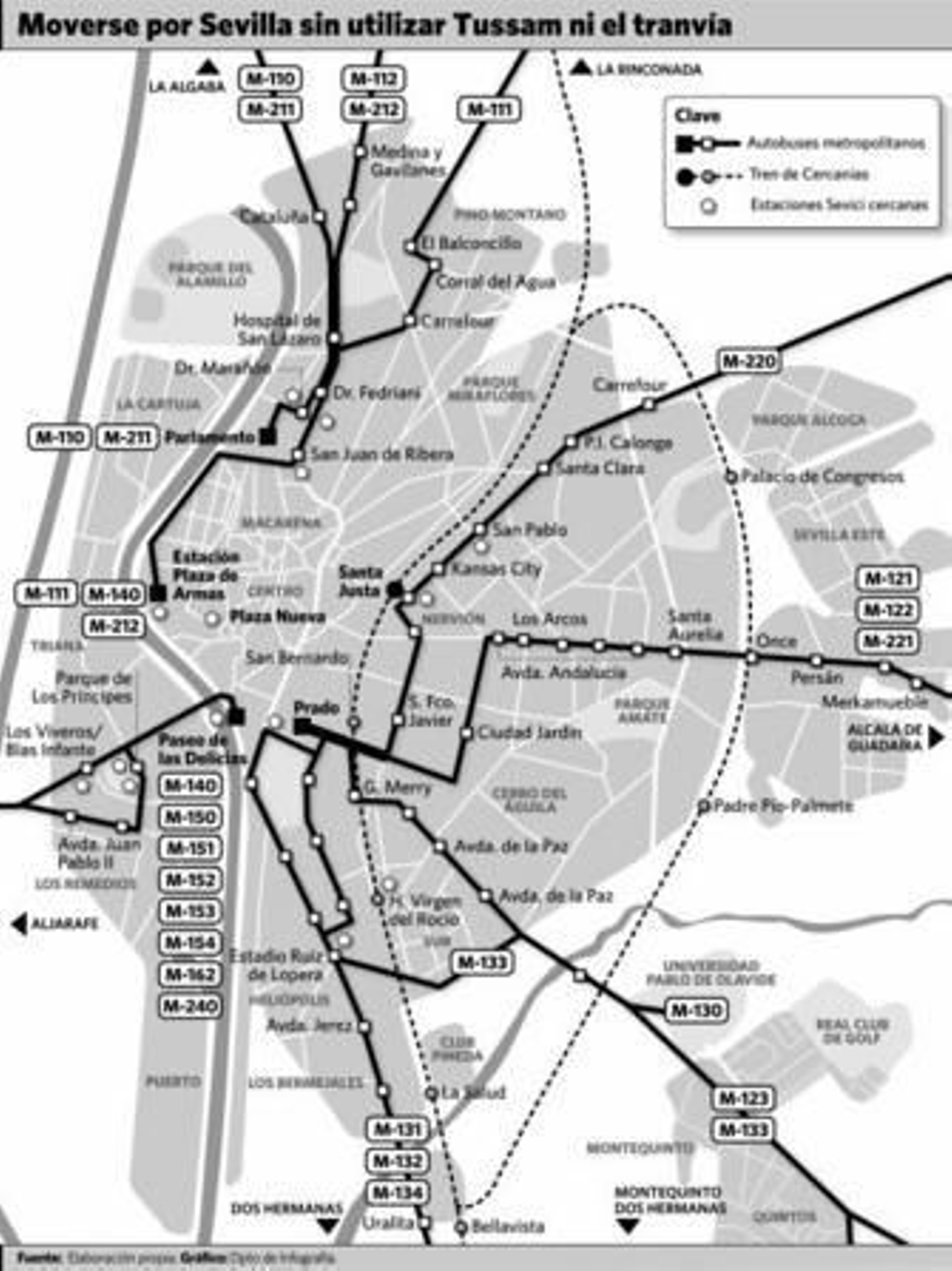 Para no esperar una hora a Tussam, los usuarios pueden aprovechar las paradas en la capital de las líneas metropolitanas que van al centro o a sus aledaños y luego coger bici de alquiler, taxi o Cercanías