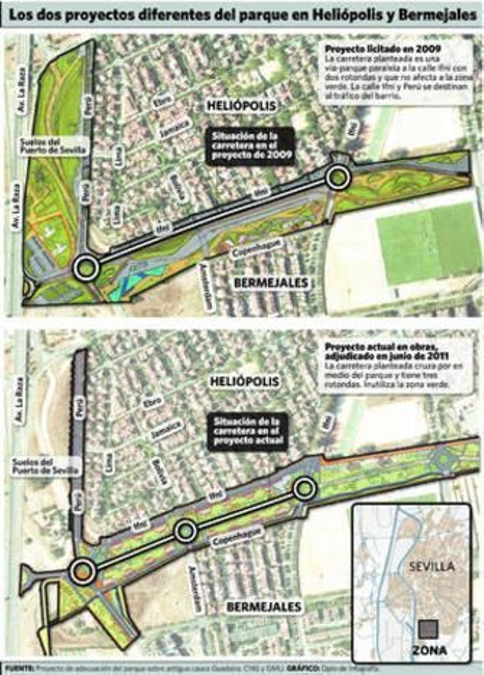 El proyecto original que reclama Heliópolis (ver infografía) contempla una vía-parque de hormigón al borde de la zona verde, a la altura de la calle Ifni, con dos rotondas en los extremos, para tráfico lento (el tráfico del barrio) y un tratamiento especial que la integra en el barrio. La calle Perú también tiene un tratamiento especial para tráfico lento del barrio. La idea es que las calles Ifni y Perú sean para los vecinos y los usuarios del parque, sin más carga de tráfico que la de ámbito local y del entorno de Heliópolis. El proyecto original incluye los suelos del Puerto (entre la calle Perú y la Raza), terrenos excluidos de la obra actual, y una serie de lagos. La paradoja es que este diseño original recibió varios reconocimientos internacionales como ejemplo de integración social y participación ciudadana, e incluso aparece en la guía de arquitectura contemporánea de Sevilla 2000-2010.