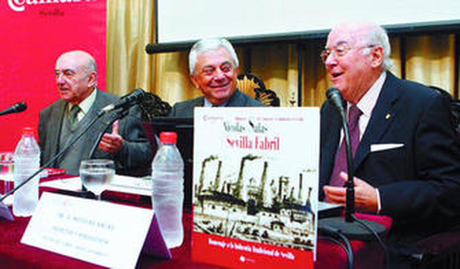 El periodista Nicolás Salas presentó ayer en el Ateneo su nuevo libro Sevilla fabril. Homenaje a la industria tradicional (Edit. Guadalturia), tercer título de la Biblioteca Fundación Cámara de Comercio, Industria y Navegación. Tras Sierpes universal y Mercurio Sevillano, esta entrega pretende servir de referencia básica e histórica de la industria tradicional sevillana, a la que Salas rinde homenaje como motor económico de la ciudad desde el siglo XVI hasta la actualidad, recuperando la memoria histórica, mediante documentos y más de 400 imágenes. Completarán esta biblioteca, encargo de la Cámara de Comercio sevillana, dos nuevas obras: La Navegación y Hoteles y Hostelería. Salas destacó el papel del empresariado extranjero en el desarrollo industrial sevillano, citando como ejemplo, en el pasado, la fábrica de cerámica de La Cartuja, y en el presente, la industria aeronáutica. Enrique Barrero, presidente del Ateneo, recordó la vinculación de Salas con la institución: Premio Ateneo de ensayos taurinos (1973) y de Novela (1986) con Morir en Sevilla, socio de honor, y rey Baltasar en 1977 en la Cabalgata.