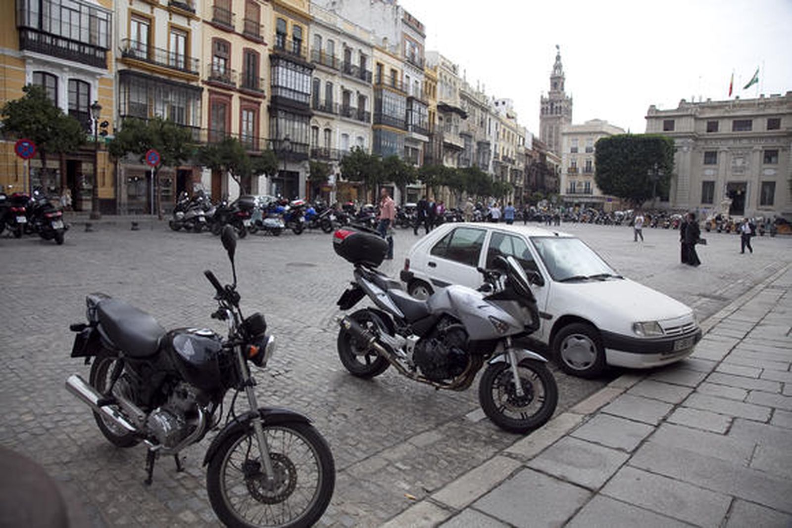 La Plaza de San Francisco es lugar habitual de aparcamiento de motos y entre tanto vehículo de dos ruedas, un intruso. Un coche estaciona en la mencionada plaza, seguro que harto de buscar aparcamiento, e intenta pasar, sin éxito, desapercibido.