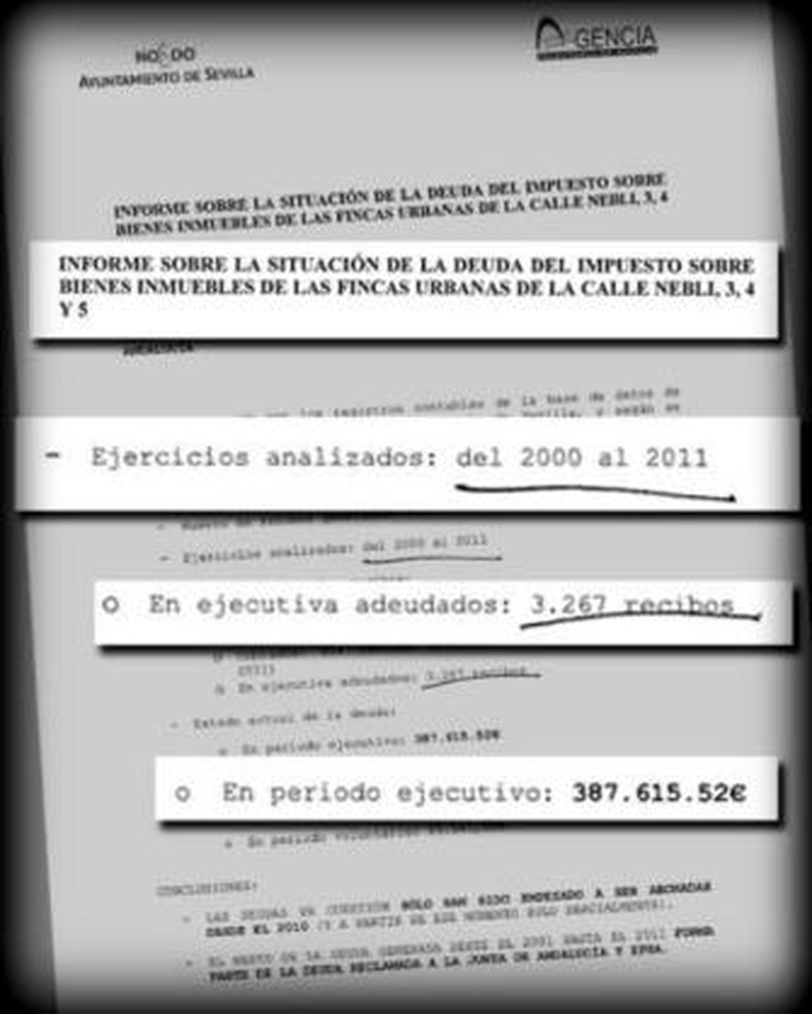 La Junta ha anunciado que ya no paga más lo que, en realidad, casi nunca ha pagado. La Consejería de Obras Públicas expuso hace unos días que por problemas presupuestarios no podía seguir asumiendo el pago de los recibos del Impuesto de Bienes Inmuebles (IBI) de las viviendas sociales de la calle Neblí, cuando la Administración autonómica debe por este tributo 387.615, 52 euros correspondientes a los pisos de los bloques 3, 4 y 5 de dicha calle. Se trata de la conclusión a la que se llega en un informe oficial de la Agencia Tributaria de Sevilla tras practicar un barrido de los años 2000 a 2011.