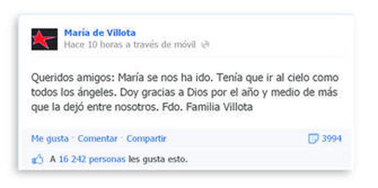 Los familiares de la ex piloto llegaron al mediodía al mortuorio, en un coche al que abrían paso dos motoristas de la Policía Local y que recogió a los parientes de María de Villota en la estación de Santa Justa, adonde habían llegado en AVE desde Madrid. María era hija del también ex piloto de automovilismo Emilio de Villota. En las puertas del tanatorio esperaban decenas de reporteros, tanto de la prensa generalista como de la deportiva y del corazón. La hermana de la fallecida, Isabel, anunció que María de Villota será enterrada en Madrid en la más estricta intimidad. La familiar de la ex piloto dijo que el entierro será en el pabellón familiar, pero no quiso precisar ni el día ni la hora ni dar más detalles del sepelio.