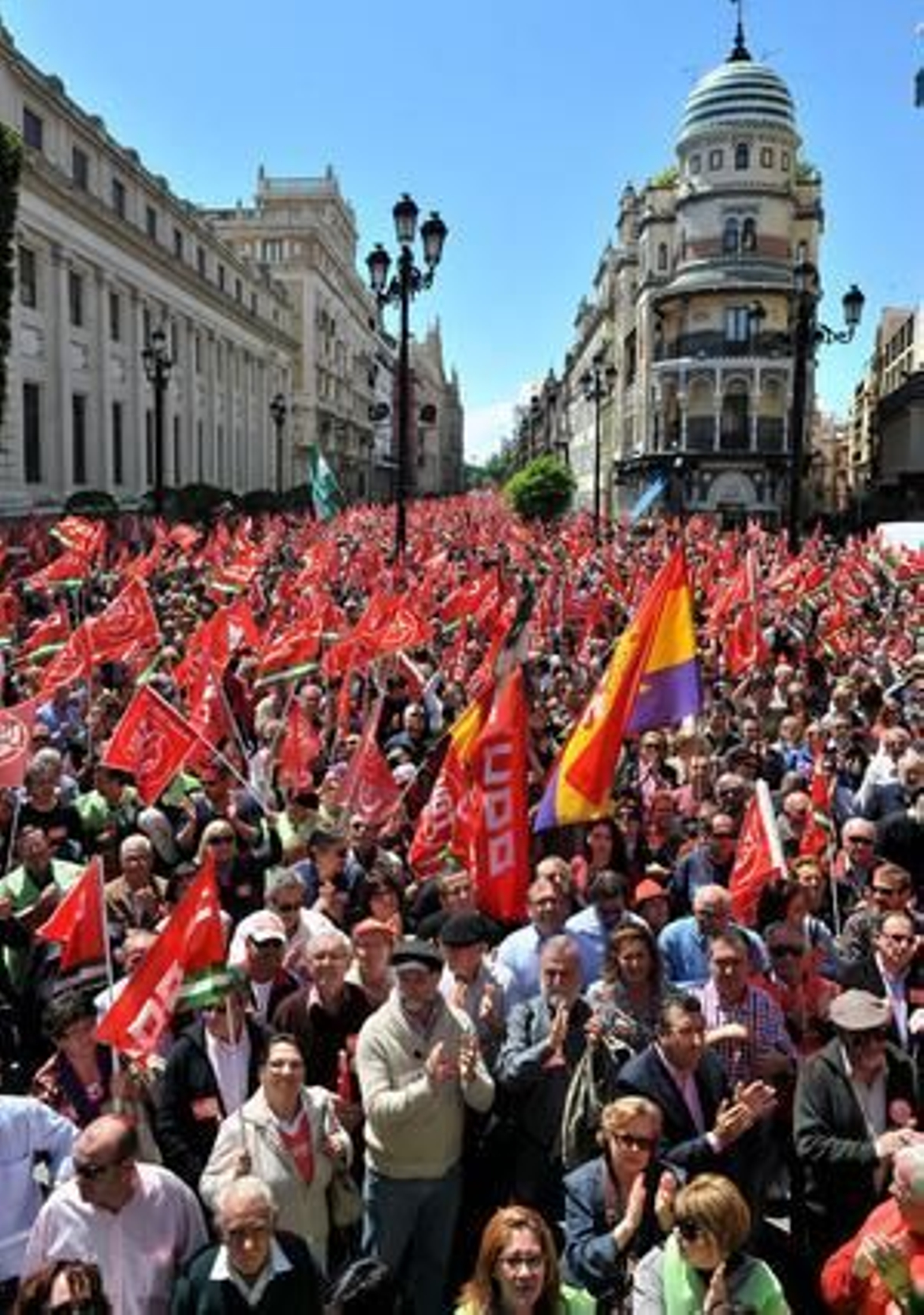En torno a la una del mediodía, la cabecera de la marcha llegó al arquillo del Ayuntamiento. Juan Antonio Gilabert, secretario general de UGT, comenzó su discurso recordando "los 8,5 billones de euros en negro que circula en la actualidad, el triple de hace cuatro años" y "las 24 empresas con sede en paraísos fiscales para evadir impuestos". Gilabert apuntó a estas dos lacras como posibles dianas de reformas, en lugar de los recortes que afectan a la población más vulnerable. En su turno, Alfonso Vidán, secretario de CCOO en Sevilla, recordó el drama de "80.000 hogares en la provincia que han dejado de percibir prestaciones". Las dos centrales terminaron la protesta con un nuevo llamamiento a la concentración que ha convocado la Asociación de la Prensa de Sevilla el próximo 3 de mayo, Día Mundial de la Libertad de Prensa, así como una próxima huelga de estudiantes prevista para mismo este mes.