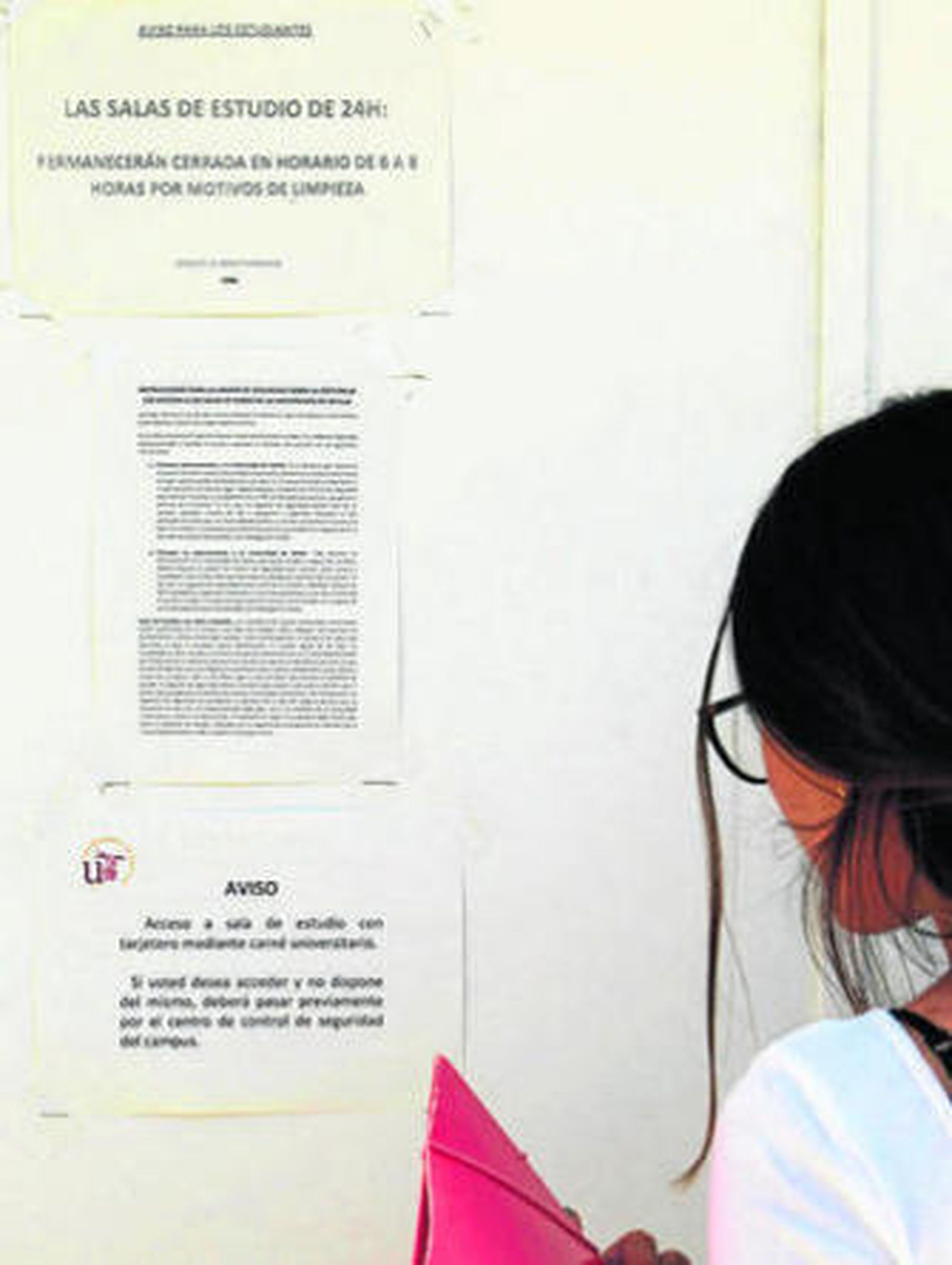 La sala permanece cerrada desde el miércoles y el viernes varios empleados de la Universidad realizaban labores de limpieza. "El cartel que hay en la puerta dice que estará cerrada de 6 a 8, pero lo cierto es que lleva toda la mañana cerrada", apuntó un joven estudiante tras salir de la biblioteca.