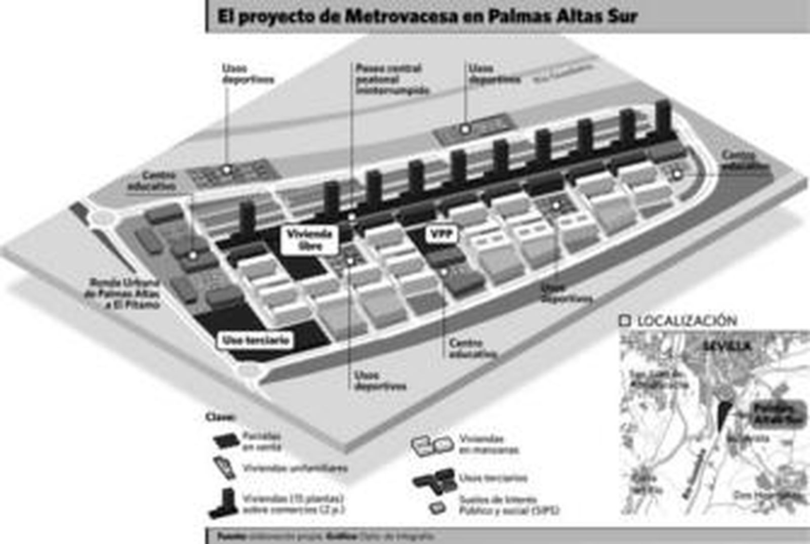 El sector inmobiliario se retira de sus posiciones en Sevilla. Metrovacesa ha puesto a la venta parte de Palmas Altas Sur, una de las mayores reservas de suelo de la zona meridional de la capital, con más de 352.000 metros cuadrados de edificabilidad y capacidad para albergar un total de 2.870 viviendas, de las que 1.232 serían protegidas. Este solar tiene una superficie total de 679.223 metros cuadrados y está situado dentro del triángulo formado por el río Guadaíra, el ferrocarril del Puerto y el principio de la variante de Bellavista de la A-4.