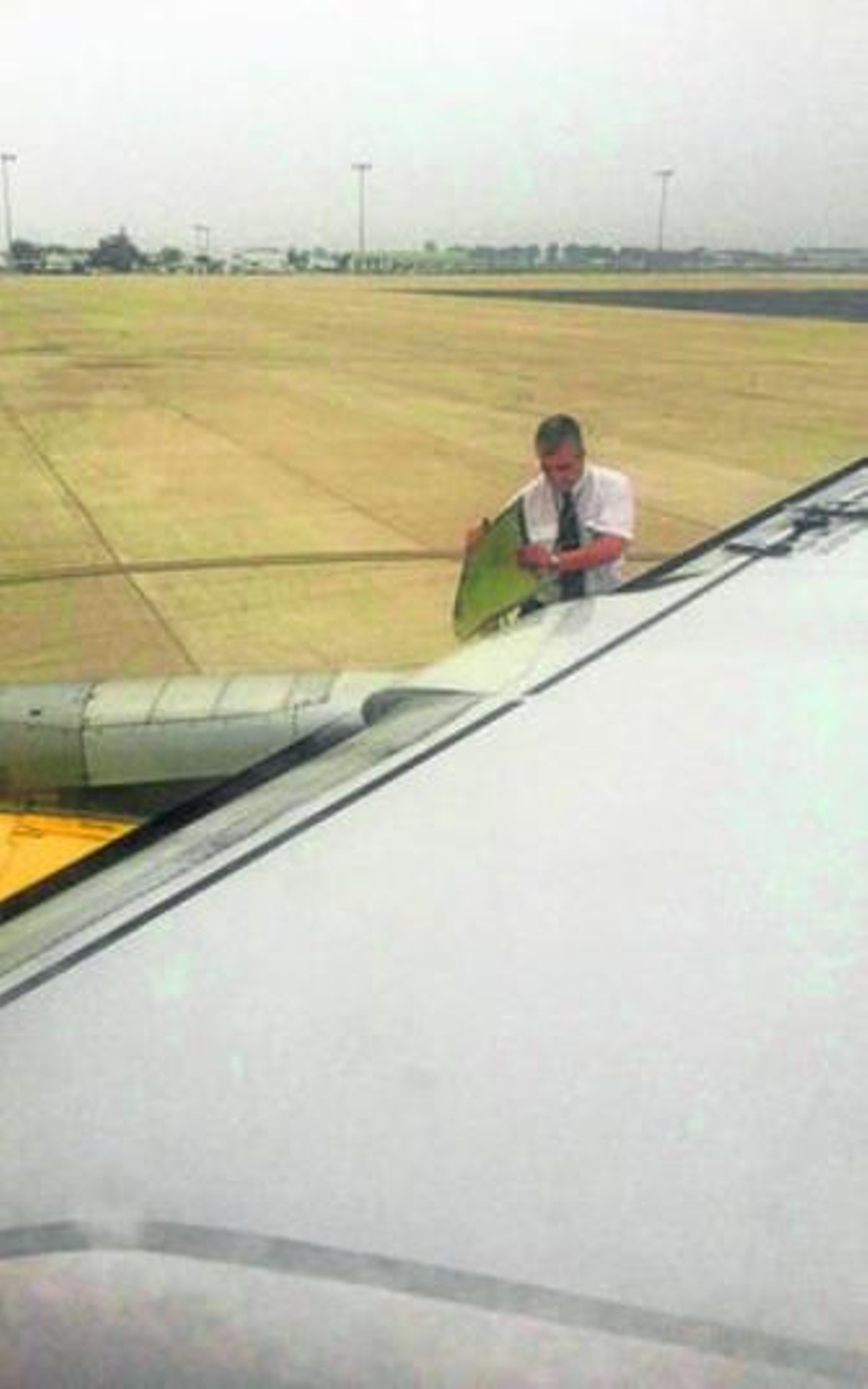 "Nos dijeron que había un problema con una válvula y que ese señor era un mecánico. No lo pongo en duda, lo único que digo es que es un mecánico muy elegante, porque es el primero que veo con camisa y corbata", explica Bico Bermúdez. "Tampoco pongo en duda que era una operación de mantenimiento, pero sí que ese hombre no tenía las herramientas adecuadas porque hubo un momento en que se lió a puñetazos con la chapa. Lo que hicieron fue una chapuza, eso sí, una chapuza que resultó efectiva porque el avión llegó. Pero yo no estaba dispuesto a pasar una hora y media acojonado por ahorrarme los 80 euros que costaba el billete". En su reclamación, este arquitecto puso a disposición de la compañía los vídeos y las fotografías que tomó, una de las cuales se reproduce junto a estas líneas.