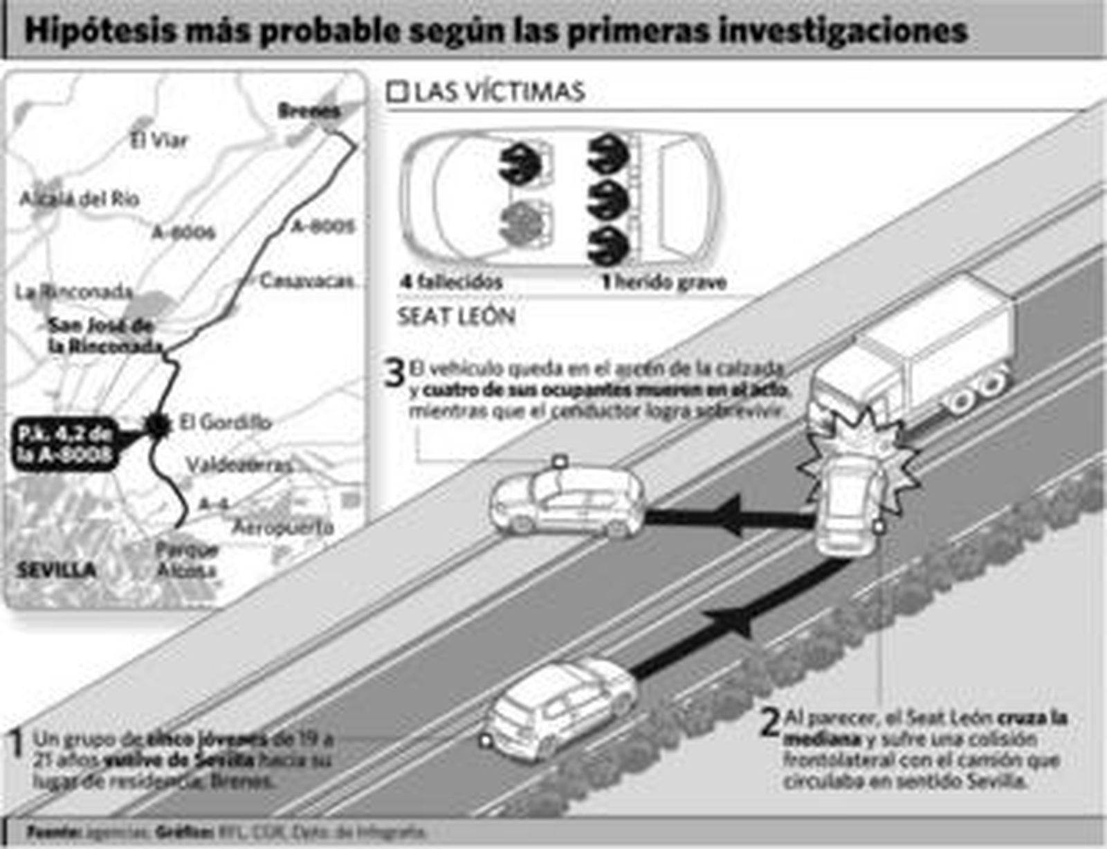 El siniestro ocurrió poco después de las tres menos veinte de la madrugada. Las 2.43 es la hora a la que se detuvieron las agujas del reloj de pulsera de una de las víctimas, que ayer por la mañana todavía podía verse en el arcén de la carretera. A esa hora, uno de los dos vehículos implicados en el siniestro invadió el carril contrario y colisionó contra otro que venía de frente. El choque se produjo en el punto kilométrico 4,2 de la carretera que conecta el Parque Alcosa con Brenes, la A-8008, a la altura de la barriada del Gordillo.