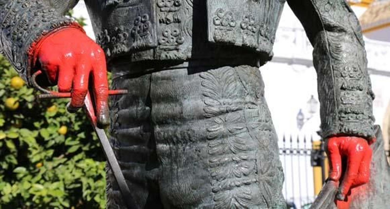 Acto vandálico sobre el monumento a Curro Romero, ubicado junto a la Plaza de Toros de la Maestranza. La escultura de bronce ha amanecido este lunes con pintadas de color rojo en la cara y en las manos y con inscripciones en las que se puede leer "asesino" o "la tortura no es cultura".