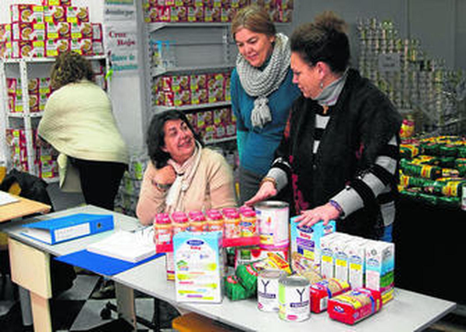 Columnas de galletas, botes de tomate triturado, packs de leche, judías verdes, arroz, lentejas y alimentos infantiles, principalmente, se apilan sobre palés. "En la última remesa, que llegó en noviembre, contenía muy poca leche para la demanda existente. Sólo podemos darles a cada unidad familiar dos litros de leche al mes hasta febrero, en principio", se queja Ana Aranda, voluntaria encargada de los trámites administrativos junto con su marido. "Somos una entidad muy seria. Llevamos un control exhaustivo y recibimos inspecciones a menudo".