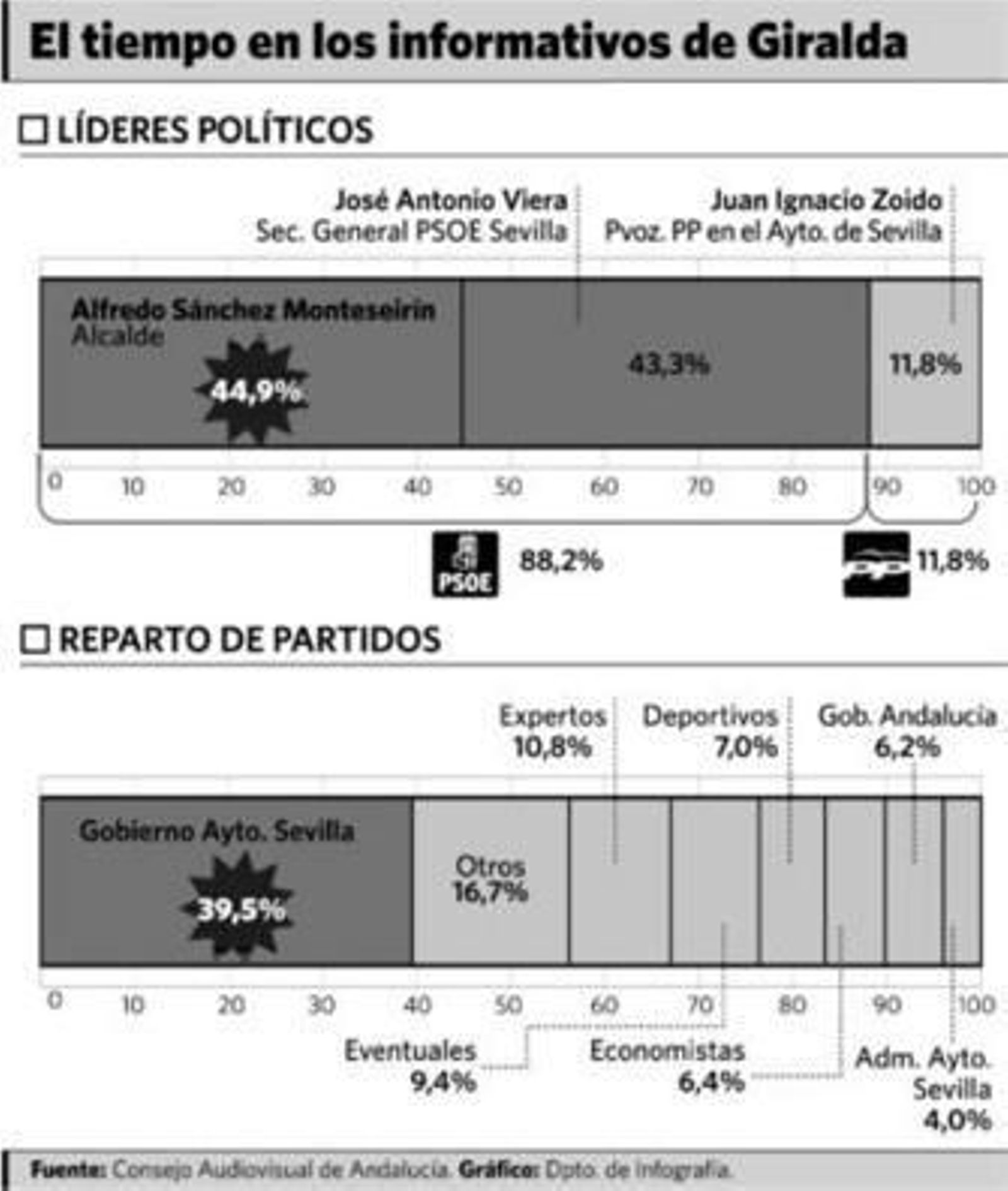 Esto supone que el PP ocupa un espacio ínfimo en la programación de la cadena, ya que el tiempo dedicado a la crónica política en los informativos no alcanza ni el 5% del total. Así, en siete días, Zoido apareció tan sólo 57 segundos en las noticias de Giralda. En cuanto al tiempo de palabra de actores políticos como cargos de sus partidos y no puestos públicos, es de nuevo Alfredo Sánchez Monteseirín quien gana en el reparto televisivo, con el 44,88% del tiempo total. Le siguen de cerca el secretario general del PSOE de Sevilla, José Antonio Viera, con el 43,31%, y muy de lejos el portavoz del Grupo Popular, Juan Ignacio Zoido, con el 11,81% restante.