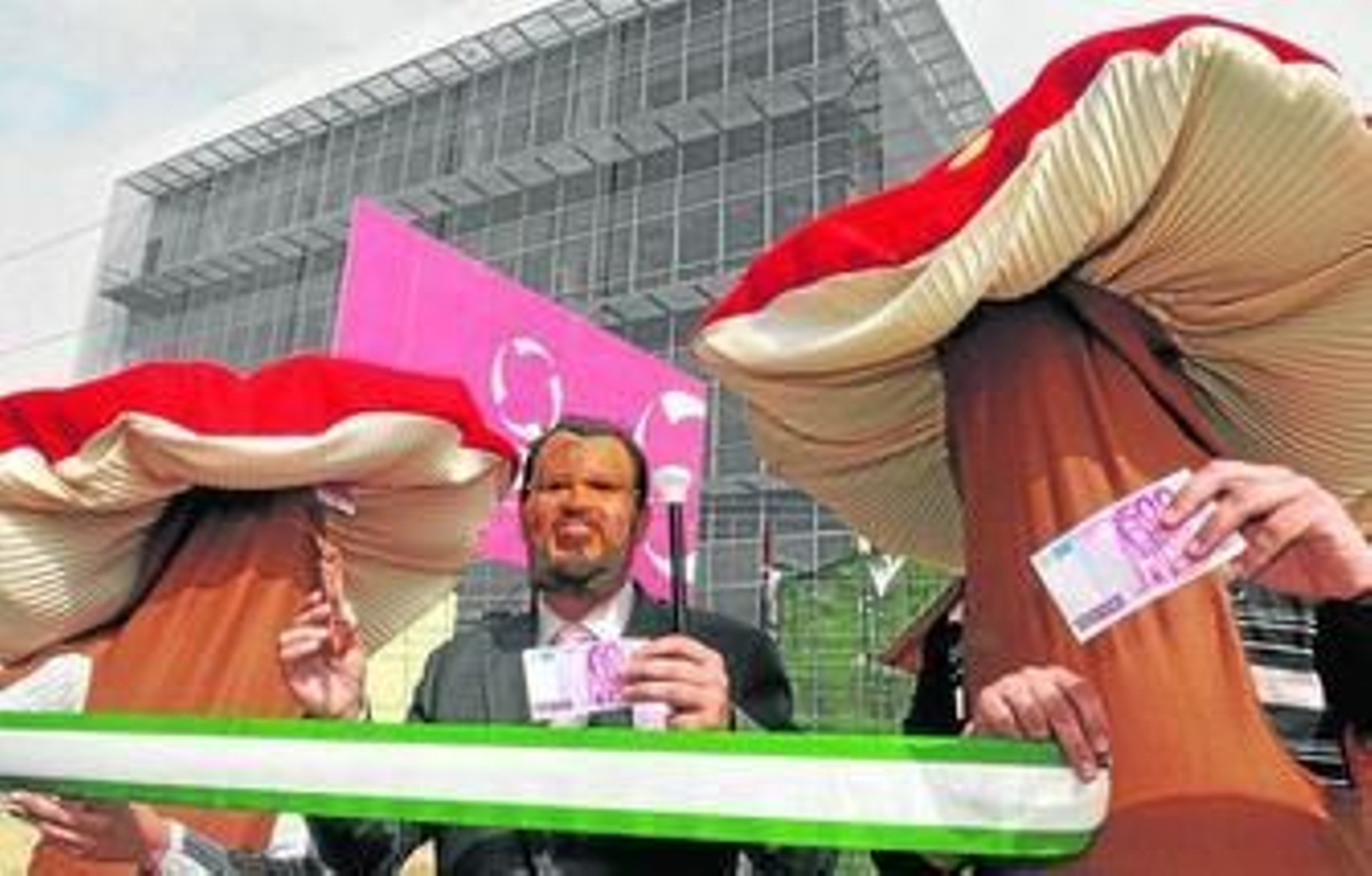 Un tipo trajeado con una careta del alcalde de Sevilla reparte falsos billetes de 500 euros a otros dos disfrazados de setas en las puertas de la futura Jefatura de la Policía Local en la Ranilla. El del traje corta con su mano derecha una cinta con la bandera de Andalucía, mientras con la izquierda sostiene un enorme langostino al que llama por el apodo de Torrijín. Detrás, unos obreros colocan apresuradamente una malla verde para evitar que no se vea la obra y tratar de afear las fotografías que los medios hacen de esta parodia de las inauguraciones que ayer representó el Sindicato Profesional de Policías Municipales de España (Sppme) en Sevilla.