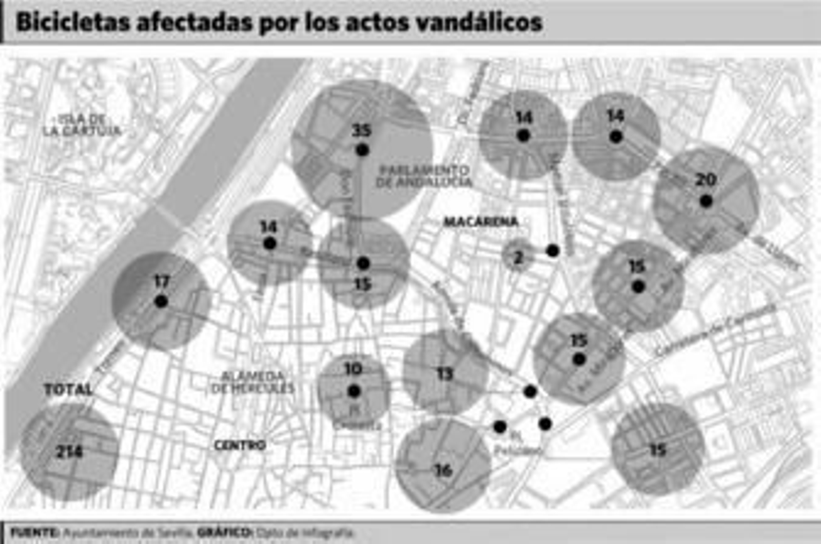 La mayoría de las estaciones afectadas están en el distrito Macarena y en la zona del casco antiguo más próxima a esta demarcación. Quien las pinchó reventó las ruedas de todas las bicicletas que estaban ancladas en ese momento. El puesto de la calle Don Fadrique esquina Gregorio Marañón, con 35 bicicletas pinchadas, fue el más afectado. Le siguen el de la avenida de Miraflores con la avenida de Llanes (con 20), Torneo a la altura de la calle Guadalquivir (17), la Plaza del Pelícano (16), los otros dos de la avenida de Miraflores, el de la ronda de Capuchinos esquina Corinto y el del Parlamento de Andalucía (con 15 cada uno), el de León XIII y el de Madreselva (con 14), el de la Resolana y el de la Ronda de Capuchinos a la altura de Maestro Quiroga (13), el de la Plaza del Cronista (10) y el de Fray Isidoro de Sevilla (2).
