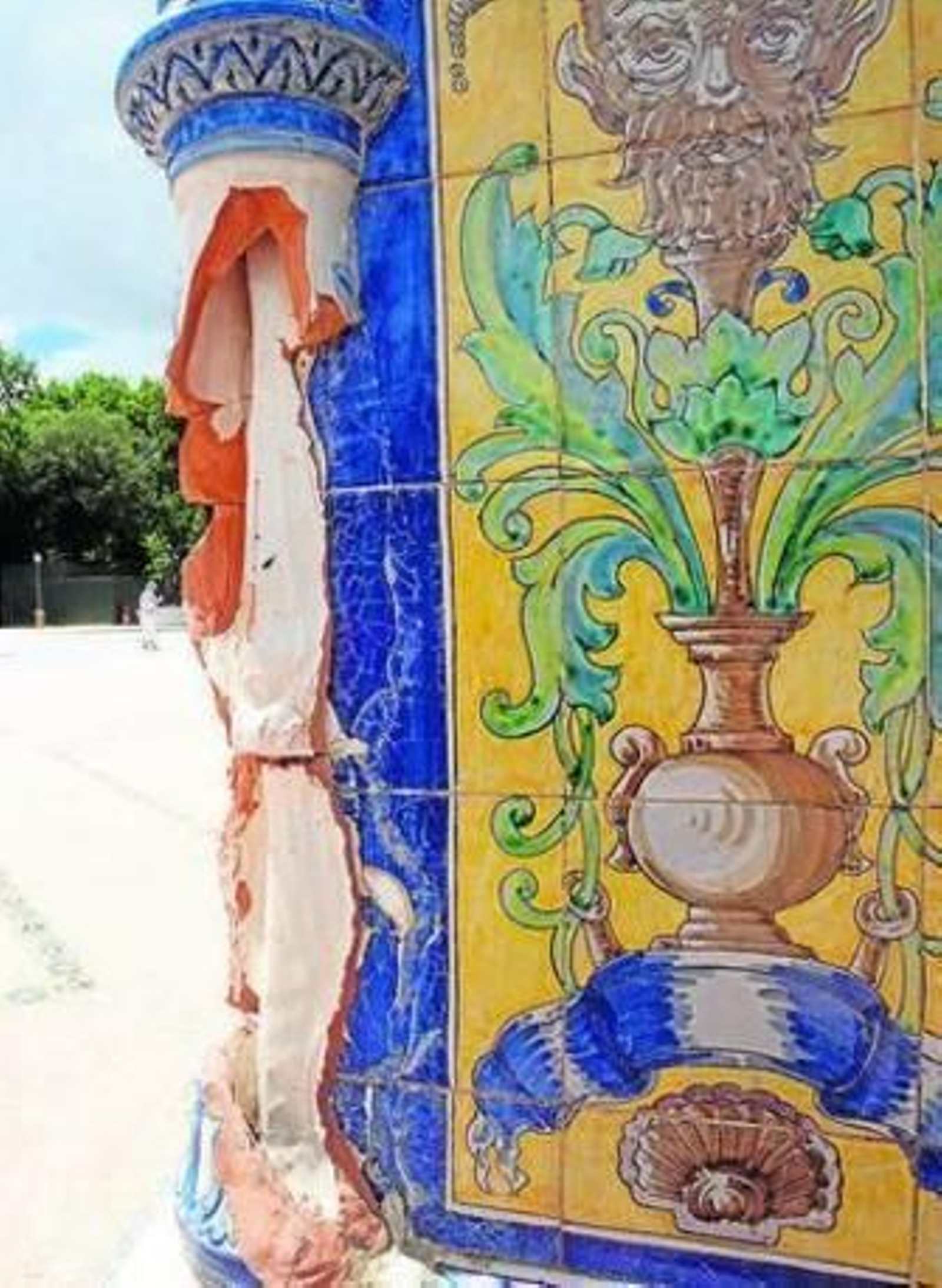 Una presa fácil del vandalismo. Quien pasee estos días por la Plaza de España podrá comprobar la vulnerabilidad de un espacio con una veintena de desperfectos. La mayoría se concentran en la balaustrada exterior y en los bancos dedicados a las provincias españolas. Estos dos espacios pertenecen a administraciones distintas. La parte exterior -la plaza propiamente dicha- es competencia del Ayuntamiento, mientras que los bancos son ya responsabilidad del Estado, al que pertenece toda la galería interior y los edificios que la conforman. Los destrozos, como viene siendo habitual en casi todo el Parque de María Luisa, se han perpetrado en los elementos cerámicos, de gran fragilidad.