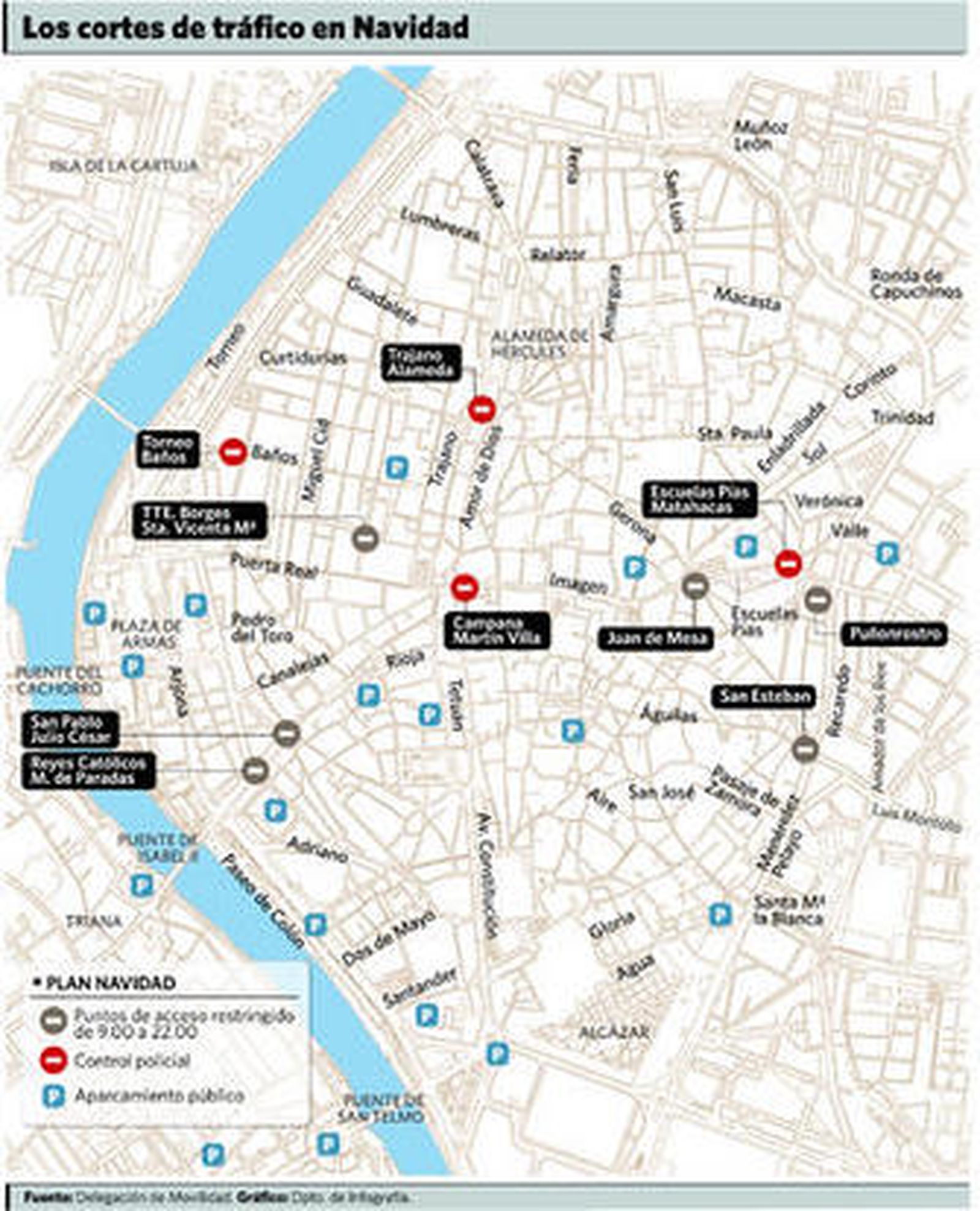 Todo este dispositivo se completa con otros dos puntos en los que habrá cortes y desvíos intermitentes de tráfico cuando lo aconseje la saturación de los aparcamientos disponibles. Son la entrada desde Torneo por la calle Baños, vía de acceso natural al aparcamiento de El Corte Inglés en la plaza de la Gavidia, y la calle Reyes Católicos a la altura de Marqués de Paradas, por donde se entra a los parkings de la zona del Arenal, Albareda y la Magdalena y a prácticamente toda la bolsa de zona azul que está vigente en el centro.