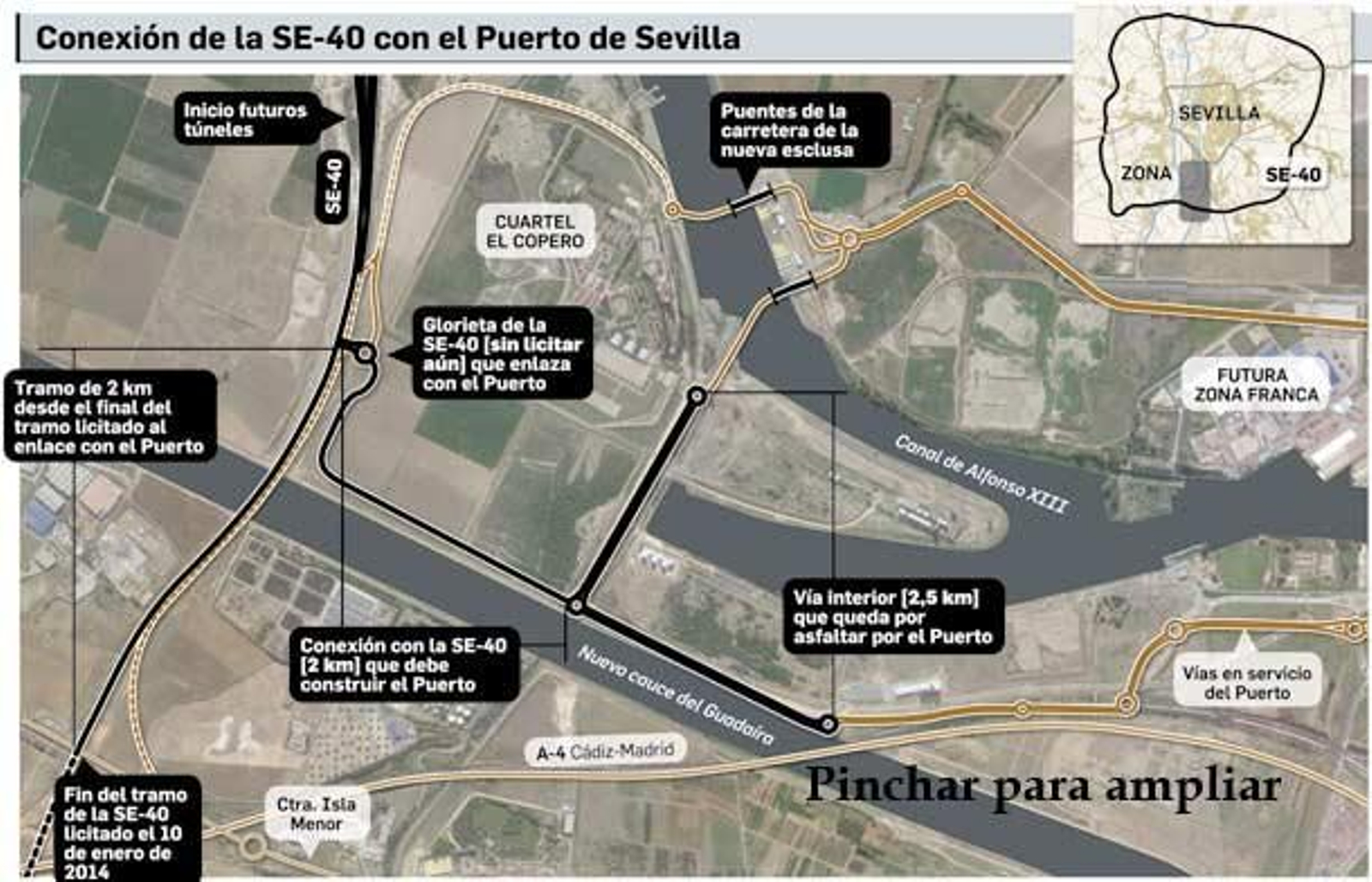 El Puerto de Sevilla espera contar con un acceso directo a la SE-40 de aquí a tres años, concretamente en diciembre de 2016. El tramo de la segunda ronda de circunvalación que le beneficia se sitúa entre el nuevo cauce del Guadaíra y el cuartel del Copero, de donde arrancará una carretera que conduce a los muelles y que debe construir y costear directamente la Autoridad Portuaria.