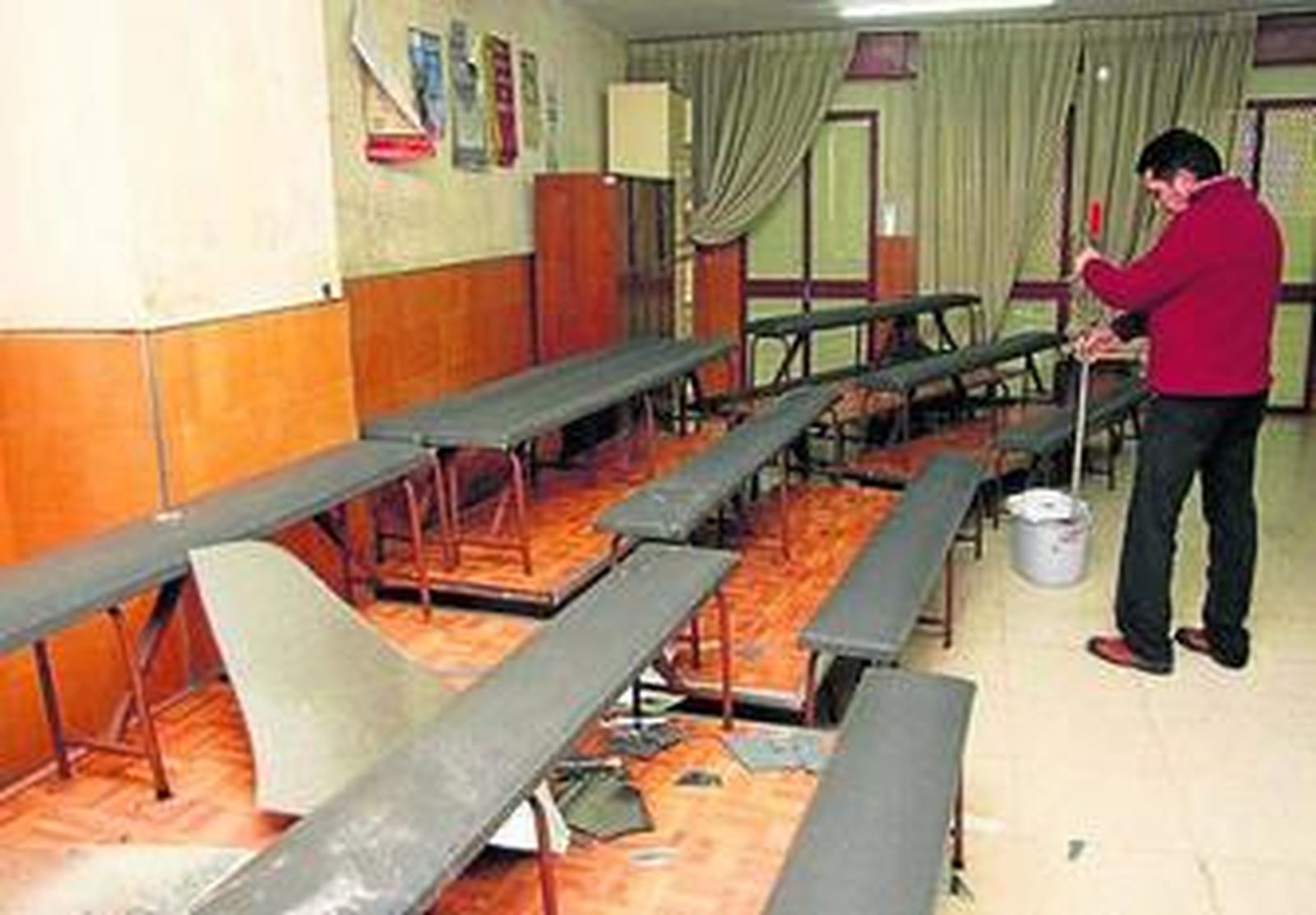 Las filtraciones de agua hacen que sea imposible dar clases en estas dependencias ante el riesgo de que el techo se desplome. De hecho, el falso techo de escayola que hay en algunas aulas ya se ha venido abajo. El agua ha llegado hasta el sótano y ha inundado el cuarto de contadores, en el que la última reforma realizada por la Delegación de Educación dejó los cables al aire libre, con el consiguiente riesgo de que origine un cortocircuito. Por este motivo, el conserje del Joaquín Turina no deja de achicar agua en todo momento para impedir que se acumule bajo los contadores.