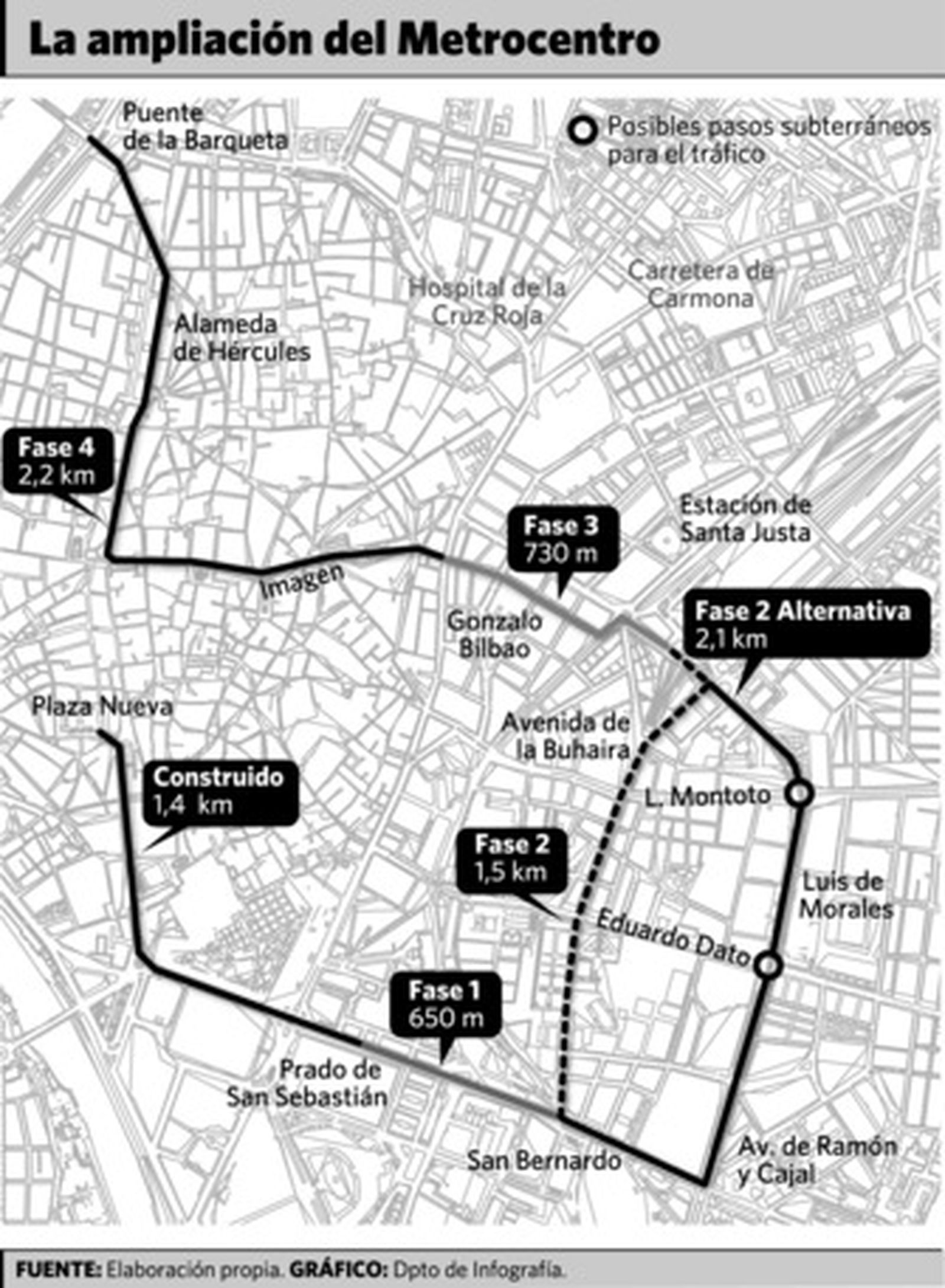 Enlazar San Bernardo y Santa Justa por Luis de Morales no sólo implicara un mayor número de metros de vías y catenarias -2.100 metros frente a los 1.500 metros de la opción de la Buhaira-, sino que conllevará "medidas para mejorar el tráfico rodado" en la zona. Carrillo rechazó la posibilidad de que parte del itinerario del Metrocentro fuese subterráneo, una solución que, en cambio, aplicó a la circulación rodada. "Están en estudio actuaciones de túneles y pasos deprimidos no para el tranvía, sino para el tráfico rodado que interconexione con el itinerario final de la prolongación del Metrocentro", sostuvo el concejal, lo que podría traducirse en pasos soterrados para el tráfico en Eduardo Dato, Luis Montoto e incluso glorieta de Kansas City.