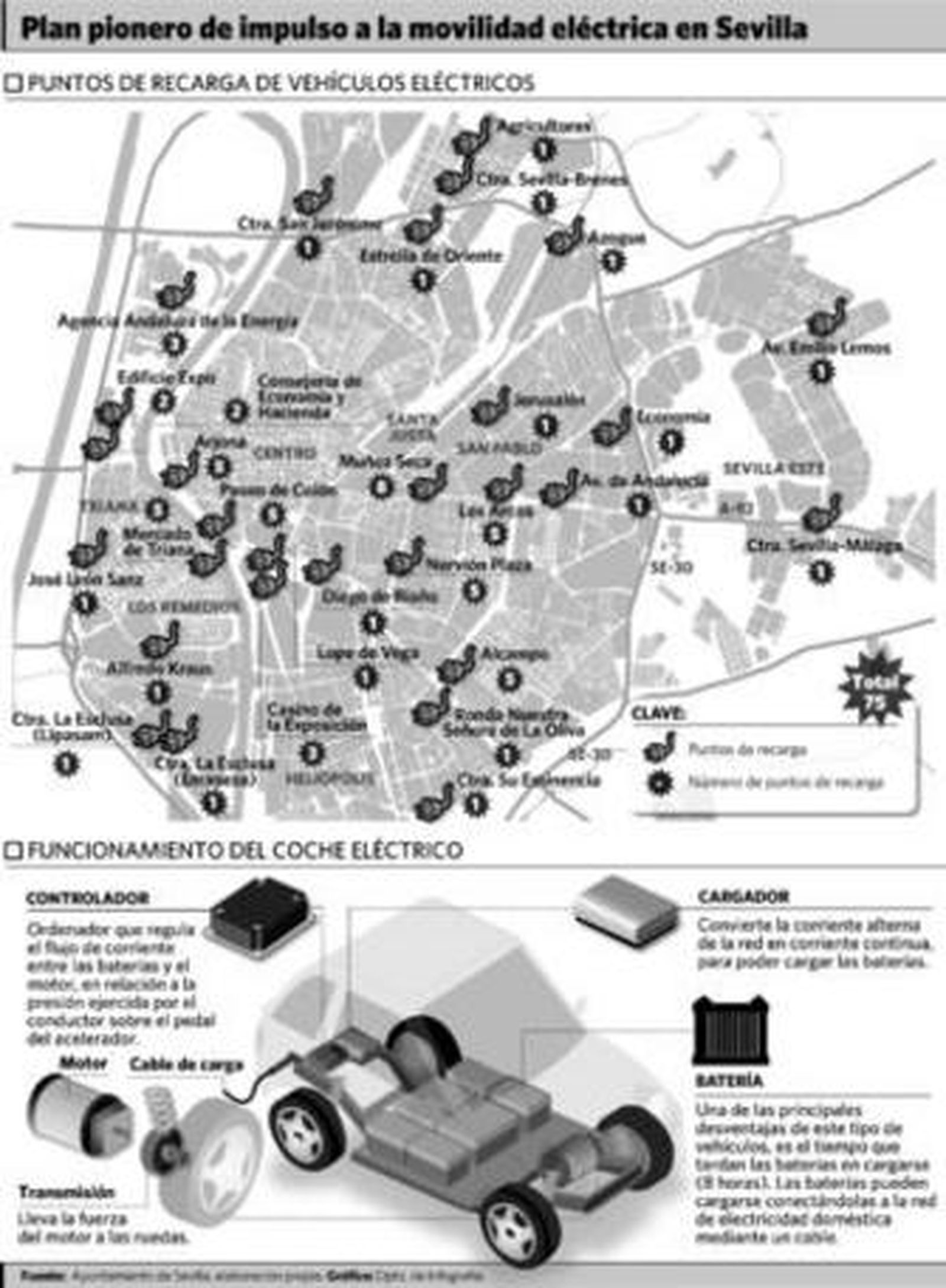 El programa presentado por Sevilla al Ministerio de Industria recoge la instalación de un total de 75 puntos de recarga de vehículos en centros comerciales y de ocio, edificios de oficinas y zonas próximas , y entorno de centros culturales. En este sentido, Vega explicó que se han propuesto puntos de recarga en los aparcamientos subterráneos de Nervión Plaza (5 tomas), Los Arcos (5 tomas), Alcampo (5 tomas), parking del Paseo de Colón (5 tomas), parking de Arjona (5 puntos) y Mercado de Triana (5 tomas más), todos ellos a cubierto. Una docena más de puntos de recarga eléctrica estarán disponibles en el entorno del Parque Tecnológico Cartuja 93, en la Isla de la Cartuja, concretamente cinco de ellos al aire libre en los aparcamientos en superficie de la Agencia Andaluza de la Energía (3 puntos) y de la Consejería de Economía y Hacienda (2 puntos) y el resto en el aparcamiento soterrado del Edificio Expo -antiguo Wordl Trade Center-.