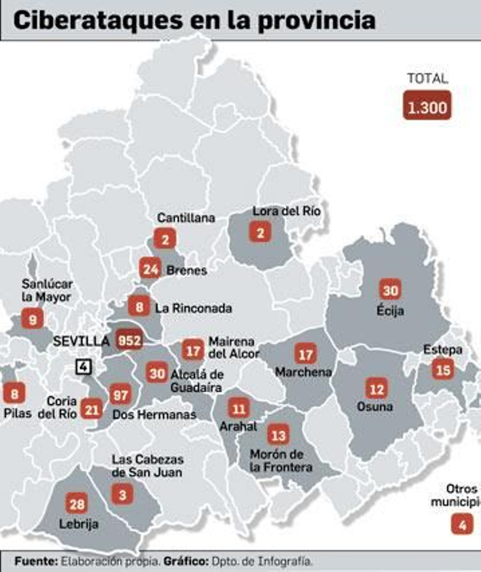 Incluso algunos pueblos pequeños y alejados de la capital, como Pedrera, por ejemplo, han registrado ciberataques. En el caso de Pedrera fueron nueve las incidencias detectadas. Los pueblos en los que menos casos se dieron -en los municipios más pequeños no hubo actividad delictiva- fueron Lora del Río y Cantillana, con dos ataques cada uno.