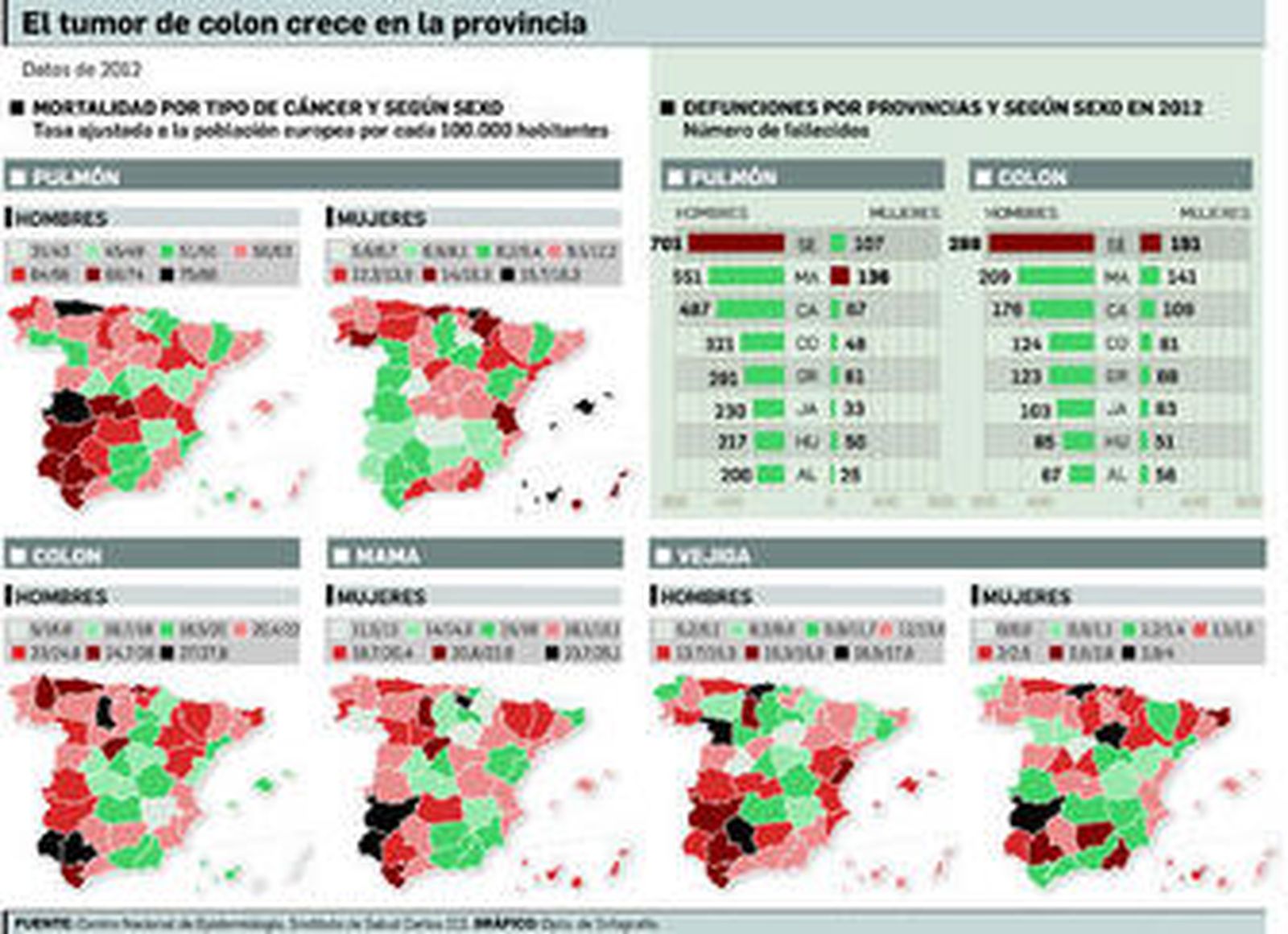 Más recientes son los datos del Instituto de Salud Carlos III, que indican que en 2012 fallecieron en Sevilla 701 hombres y 107 mujeres por cáncer de pulmón. Estas cifras convirtieron a Sevilla en la segunda provincia con más defunciones masculinas, sólo por detrás de Palencia y seguida por Huelva y Cádiz, en ese orden. En el caso del cáncer de colon, en Sevilla fallecieron 288 hombres y 151 mujeres en 2012. Aquí, la provincia también se sitúa en segunda posición detrás de Palencia nuevamente si se tiene en cuenta la tasa de mortalidad por cada 100.000 habitantes.
